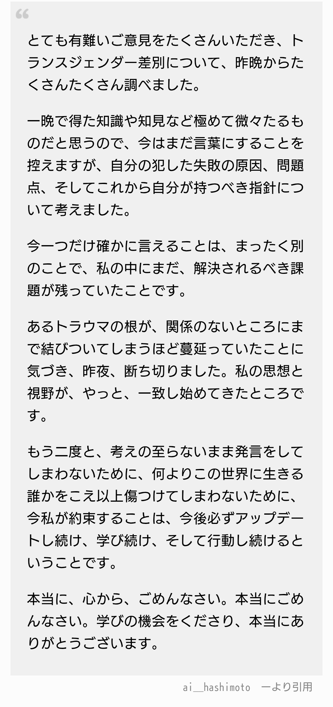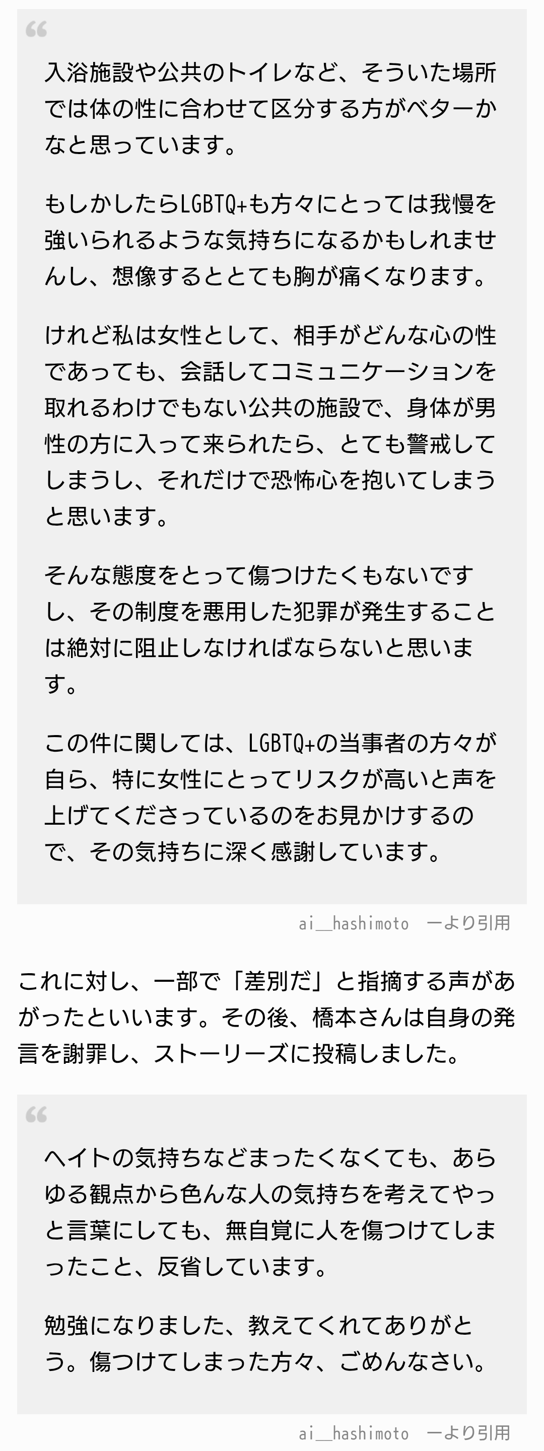 橋本愛はトランスジェンダーのトイレ風呂利用で左翼に喜ばれない意見書いて叩かれて、あわてて謝罪して以降は左翼様の機嫌取りしてるからな