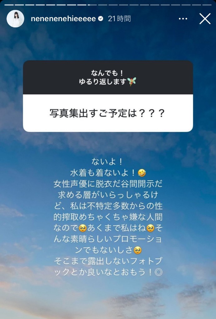 超人気声優「ないよ!🤣私は不特定多数からの性的搾取めちゃくちゃ嫌なので🥺」