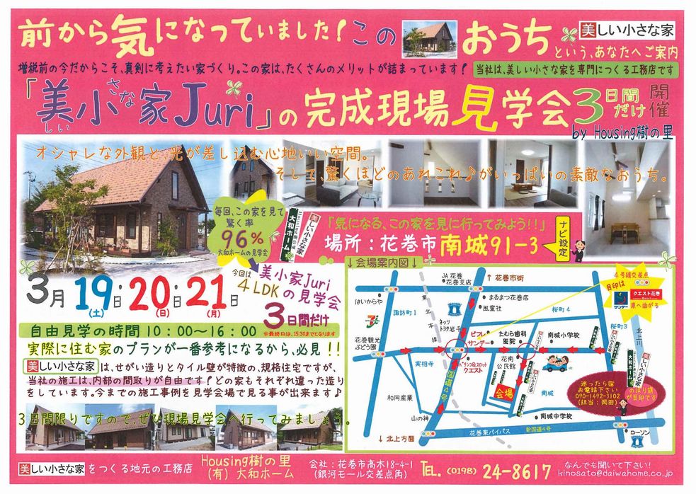 2016年03月08日 完成見学会のご案内 3/19(土)~21(月) の3日間 美しい小さな家の完成見学会を開催いたします。みなさまからご好評いただいているシリーズとなっておりますので、お見逃しなく♪※最終日の3/21(月)は、15時半までとなりますので、ご了承くださいませ。
