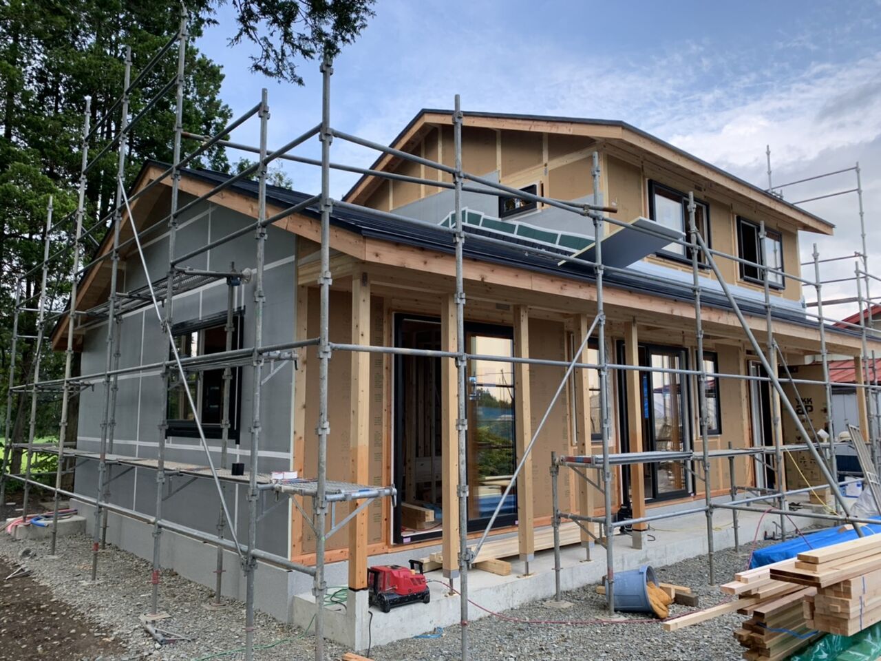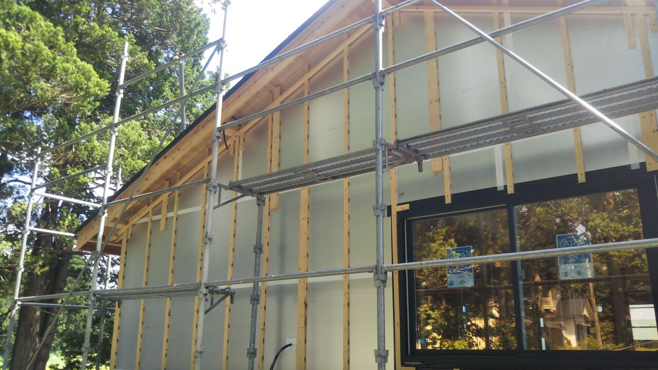 2020年08月26日 外装工事の準備をしています 外壁工事の下準備中です実は、外装材の施工の向きによって、この下地材の施工の仕方も変わります外装材を縦に張るか、横に張っていくのか・・・ということですね来月中旬ころには、外装工事写真をアップできると思いますのでお楽しみに♪♪