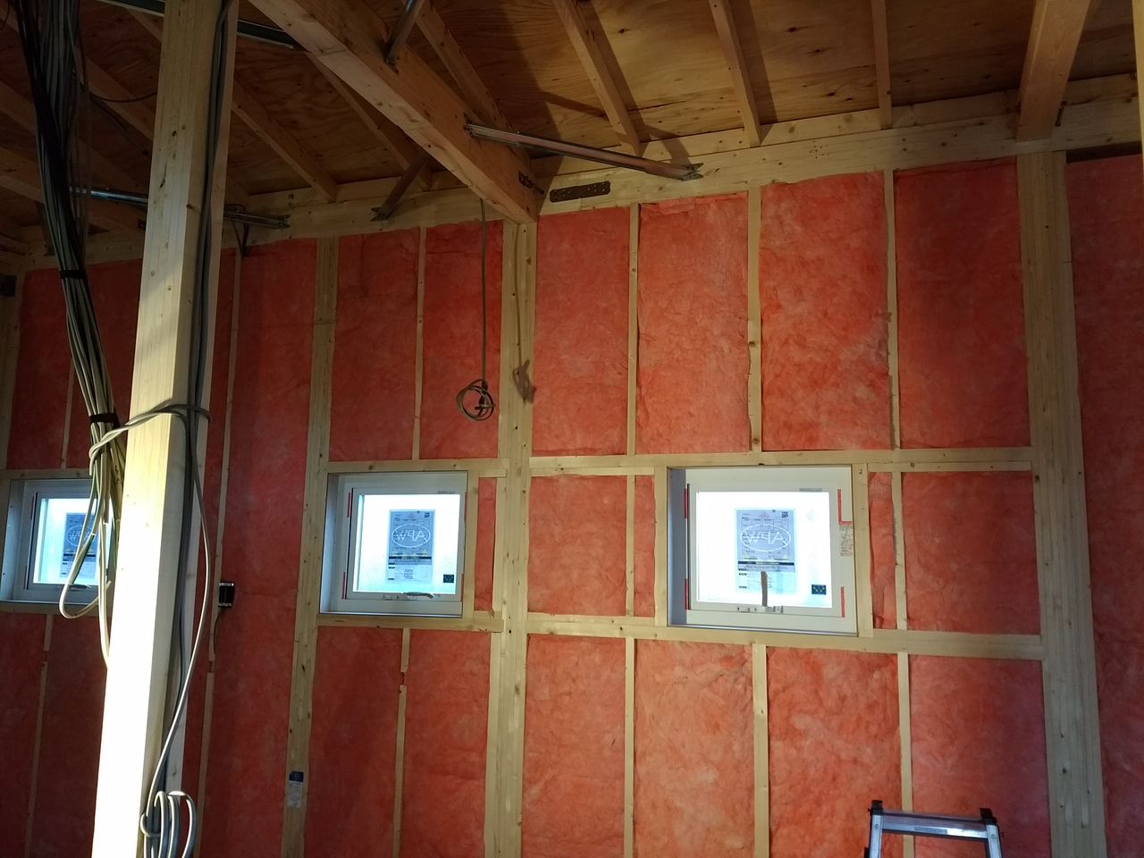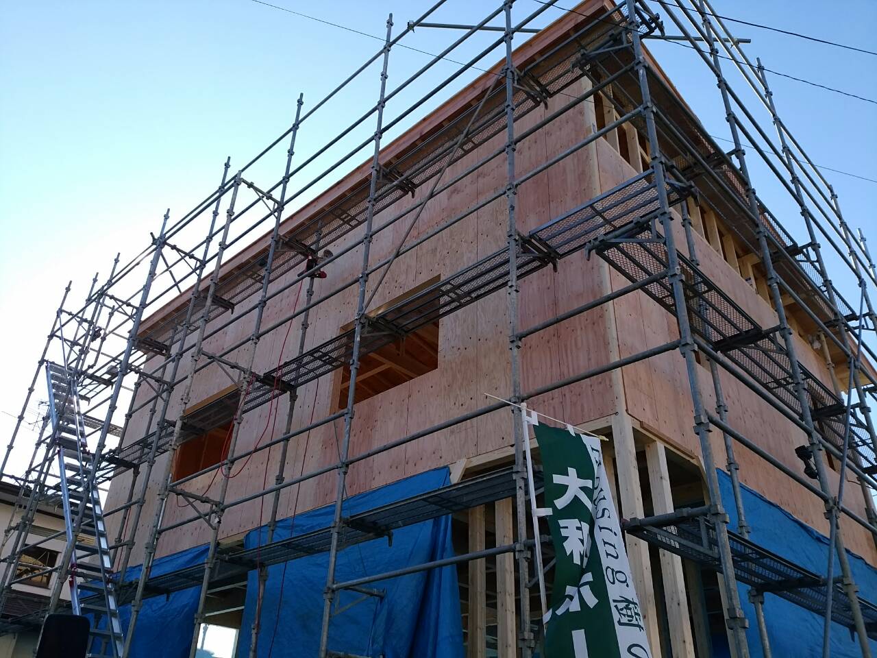2016年12月01日 □■*:;;;:*□樹里 上小舟渡 S様邸□■*:;;;:*□ 躯体検査も無事合格し、内部では断熱工事が始まりました。断熱をおさめた後、気密シートで覆います。外部は、屋根の板金工事や外装下地が終わりました工事は、順調に進んでおります