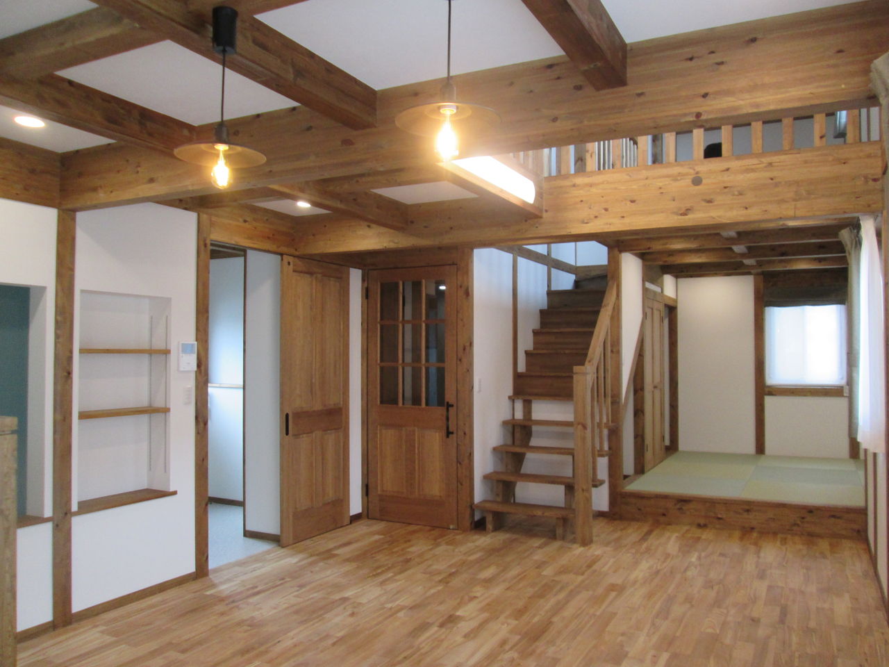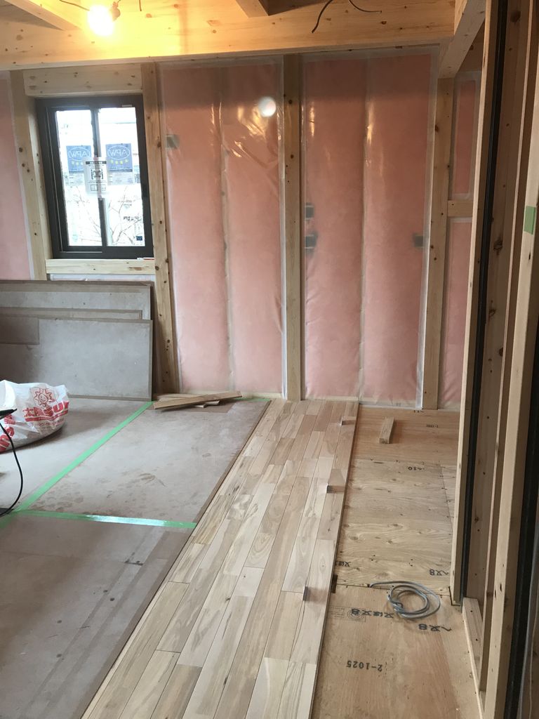 外装材を張り終わり、大工さんの内部造作・クロス張り・カーテン取付けなどが終わりました