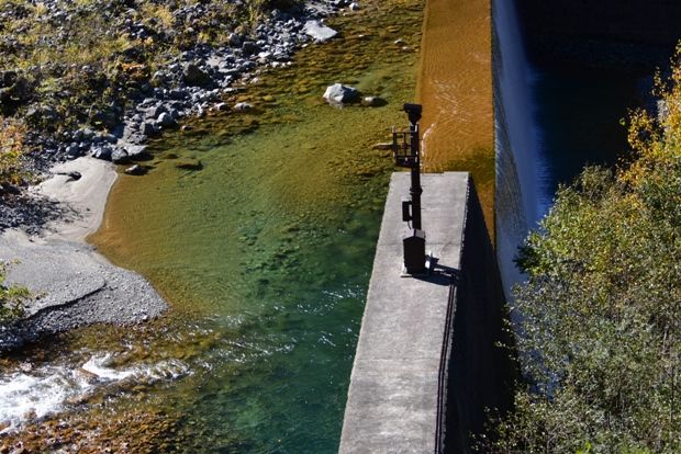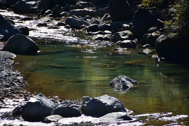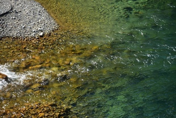 水の色がエメラルドグリーンです