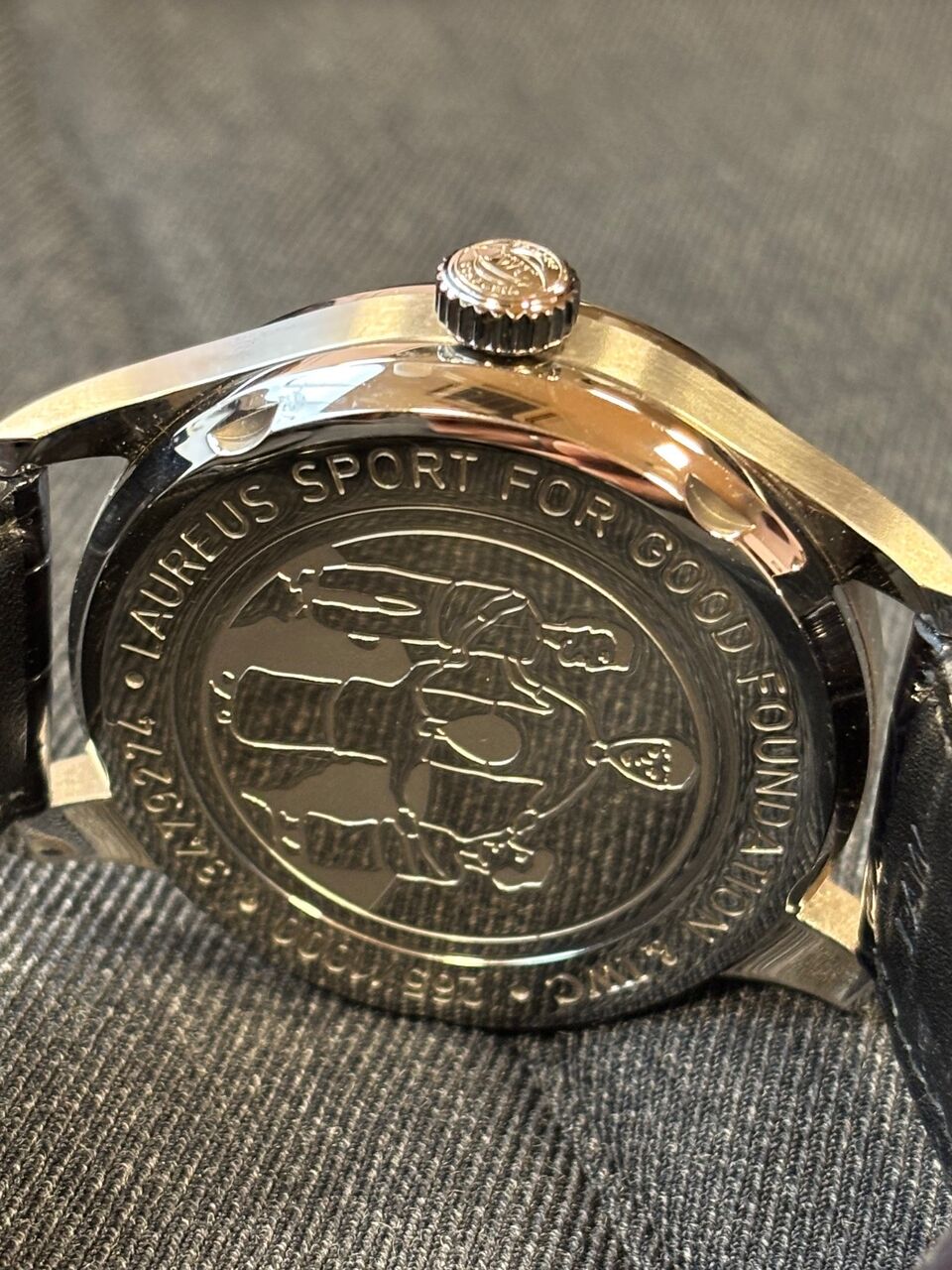 裏蓋にローレウス絵画コンテスト受賞作品の絵と限定ナンバーが刻印されてます。裏蓋の絵はスリランカの12才の少年が描いた物で、4人の若者が手を繋いで円になり 「 チームスピリット 」 を表現してます。