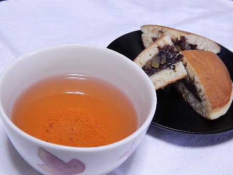 そして、どら焼きのお供は、ほうじ茶ベースのちょっぴり酸味の利いたかほりあわせのレッド系のお茶。
