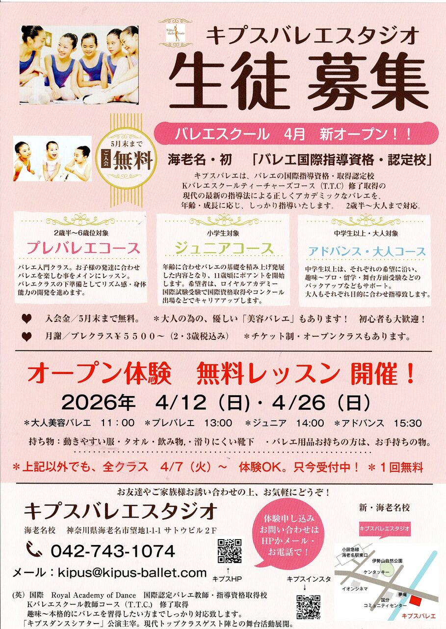 上記以外、通常のレッスンで無料体験レッスン受け付けています。