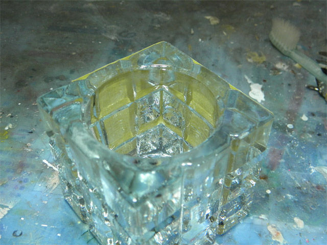 ガラス製キャンドルスタンドに追加作製した台座を接着しています。