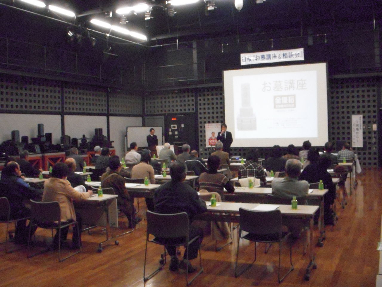2011年09月18日 岩手日報主催お墓講座IN北上 本日はご家族みんなでいらして頂いたMさんお客様のご紹介でご商談させて頂いたTさんOさん連休中の貴重な時間を頂きありがとうございました。皆さんからお聞かせ頂いたたくさんのご意見を北上石材店なりに整理させていただき皆さんの想いを次回お会いするまでに最高のカタチに致しますので楽しみにお待ち下さい。今日はお忙しい中ありがとうございました。午後から17日玉山地区18日盛岡地区19日北上地区の3日間 開催される岩手日報主催お墓講座のお手伝いに岩手日報本社へ普段は聞けないお墓の法律や世界・日本の最新お墓事情まで普段見たり聞いたりする事のない内容に皆さん終始真剣に時には笑いながら聞き入っていたので少しは来客者皆さまのお墓つくりのお手伝いが出来たと思います。そして明日はいよいよ最終日岩手日報主催お墓講座IN北上が北上市さくらホール (北上市さくら通り2−1−1 0197−61−3300)にて午後1時30分より開催されます。若干の当日席もあるようですので普段人には聞けない悩み・疑問をお持ちの方は専門のスタッフが丁寧にお答えする相談会も準備しておりますのでぜひこの機会をご活用下さい。(営業行為は一切ございません)(昨年のお墓講座IN北上のお墓講座風景)少しでも皆さまのお力になれれば幸いです。
