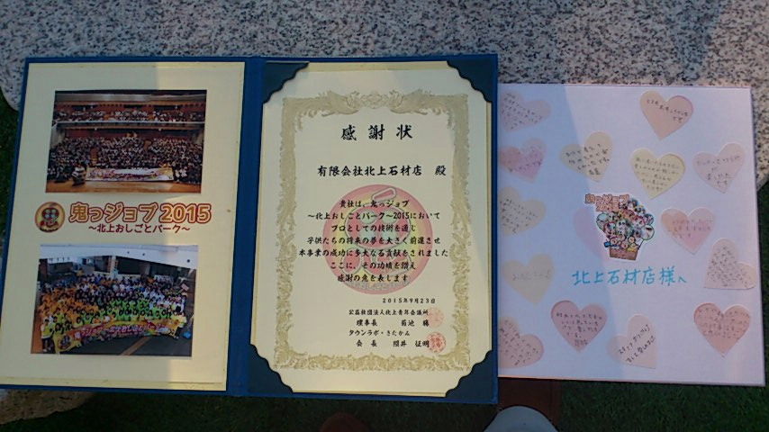 2015年10月25日 鬼っジョブ 2015 感謝状 本年も企業協力させて頂いた北上市の未来を担う子供たちを対象とした事業鬼っジョブおしごとパーク本年も北上石材店 石材アートブースはかなりの定員オーバー職業体験できなかった方々 大変申し訳ございませんでした。次回開催時に再度チャレンジしてみて下さい。よろしくお願い致します。素敵な事業に参画させて頂いた他に感謝状まで頂き ありがとうございます。この事業がある限り北上市の住み良さランキング1位は不動のものでしょう。本年もたくさんのご縁に 感謝・感謝・感謝 ありがとうございます