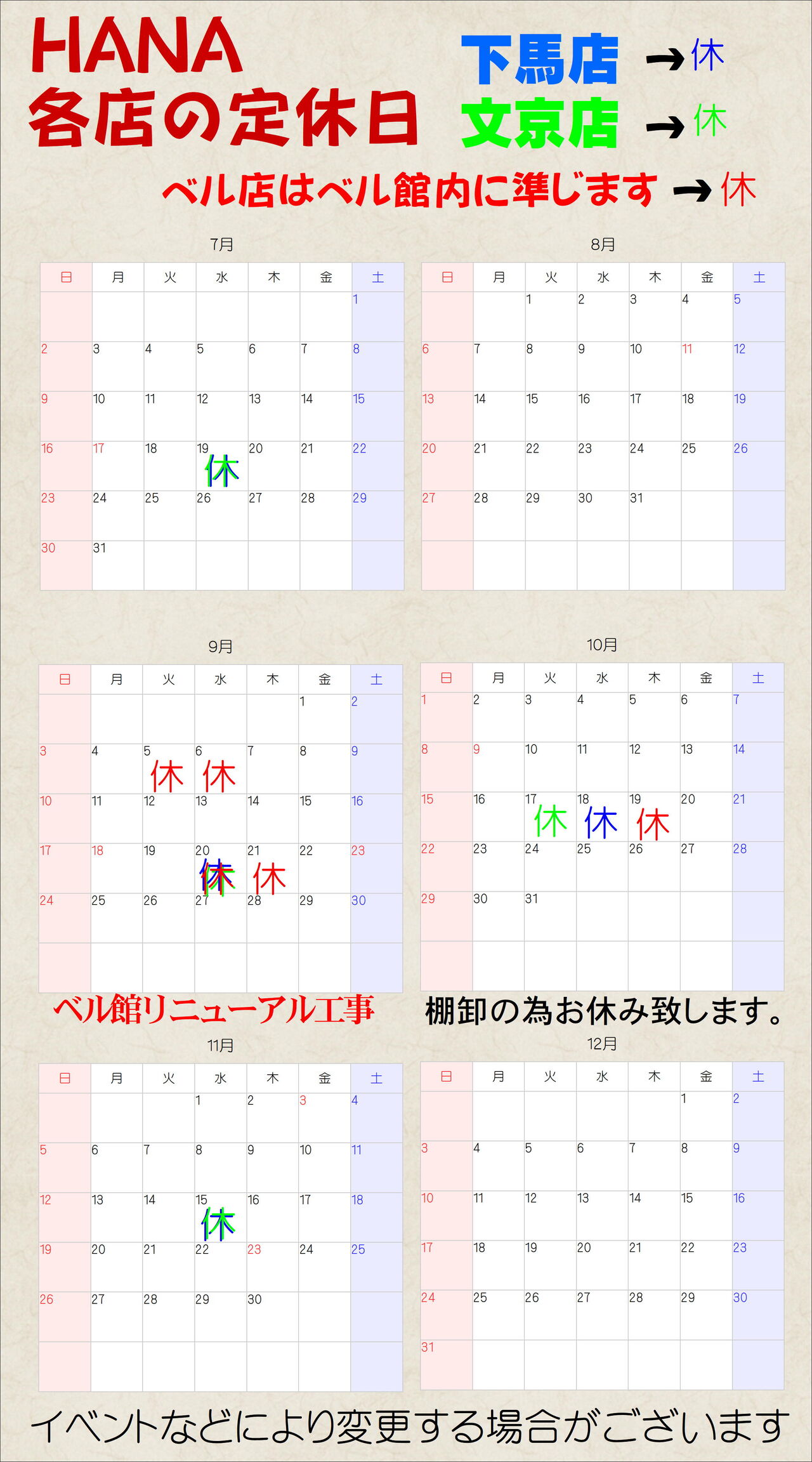 ※ベル館がお休みの時に、一緒にお休みとなります。