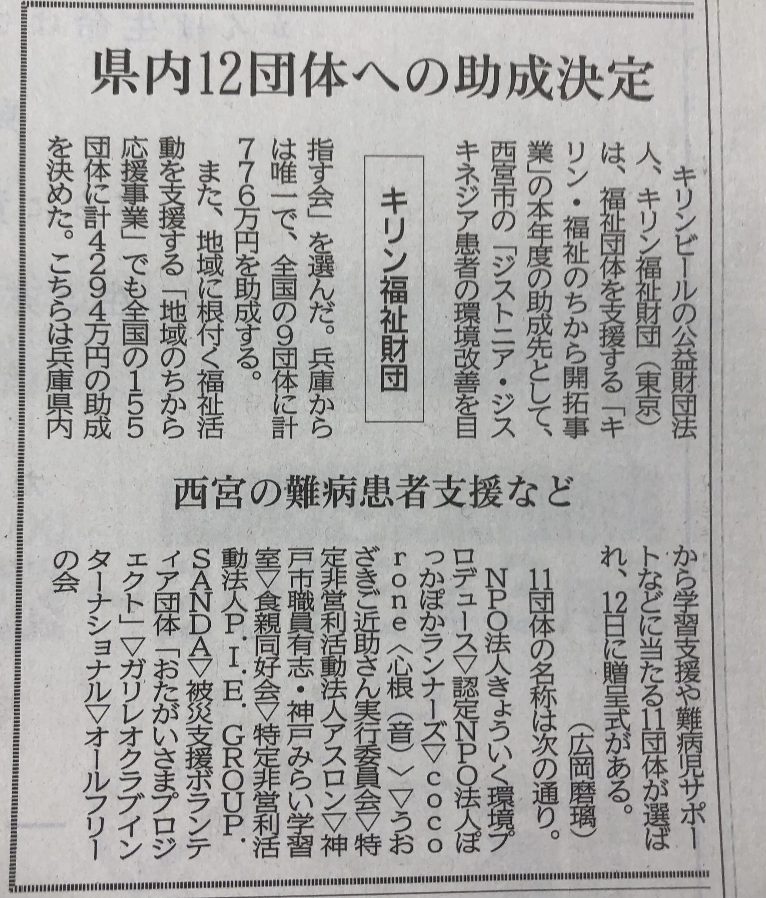 本日、キリン福祉財団・地域のちから応援事業助成金贈呈式に参加しました。