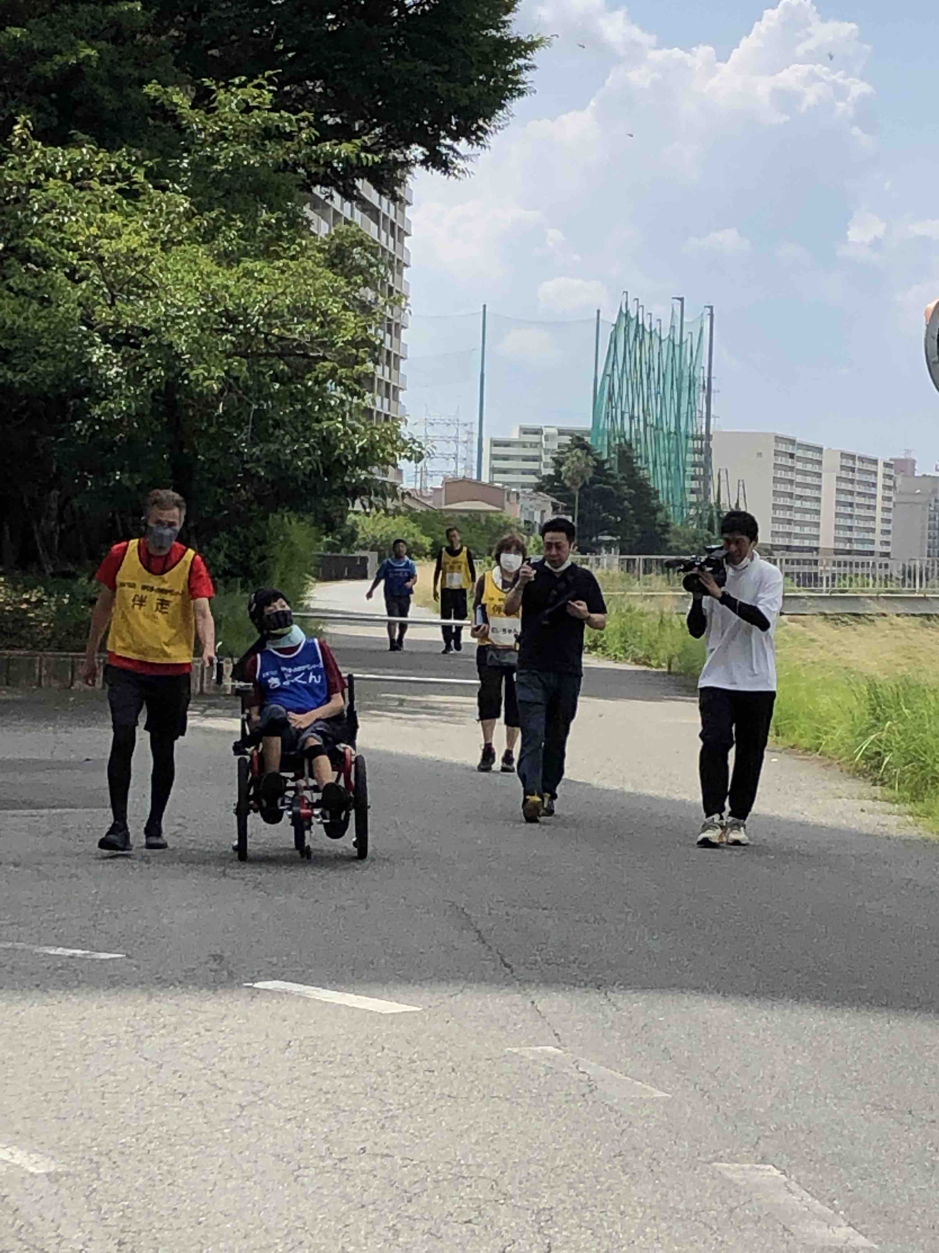 沿道では、いつも応援を受けるキヨもボランティアの皆さんと応援しました。応援場所までは足こぎ車椅子をこいでいましたが、一緒に参加しているような気になったのかな?楽しそうにこいでいました。テレビ中継で歩道走っている人みたいな感じ。