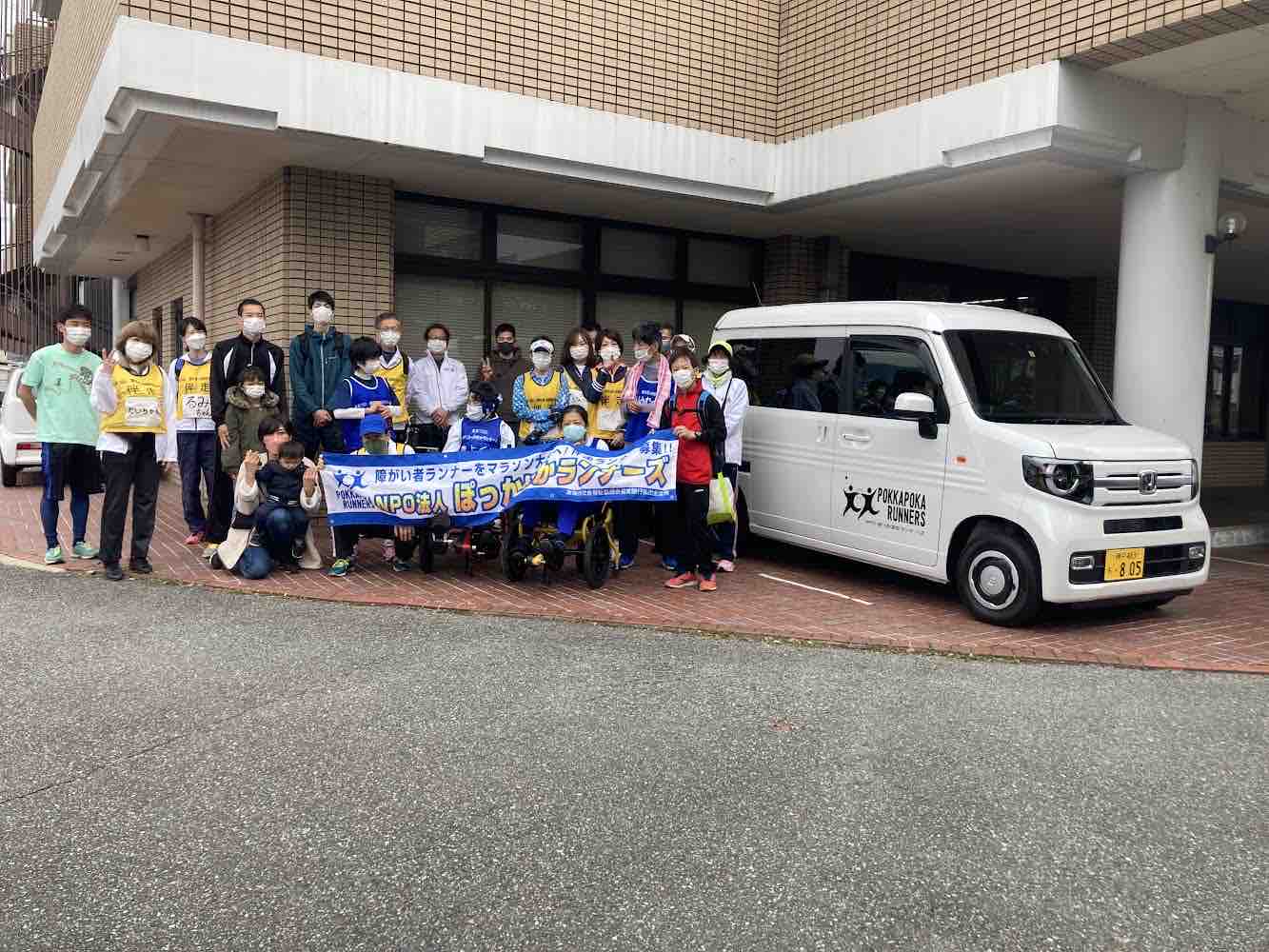 神戸やまぶき財団様からの助成金でぽっかぽかランナーズの車を購入させていただきましたので、集合写真を撮りました。軽四ですが、足こぎ車イス3台載るので、今後出張でも「足こぎ車イス体験会」をさせていただきます。