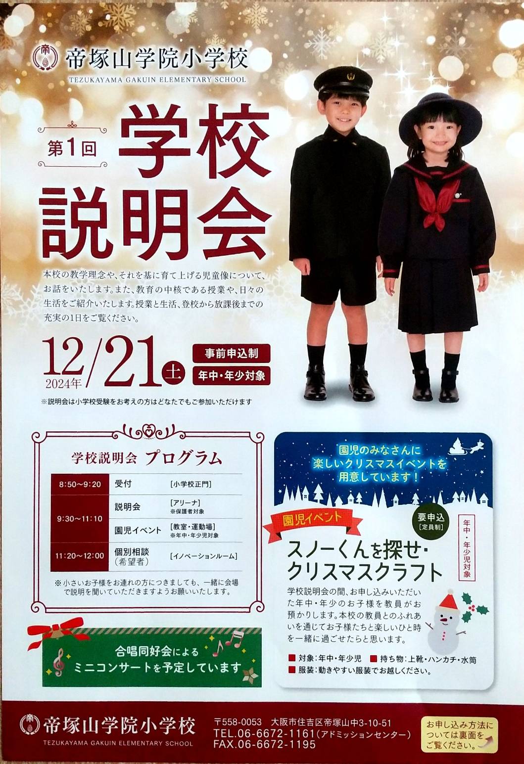大阪市住吉区にあります「帝塚山学院小学校」さんから、2024年12月21日(土)実施予定「第1回 学校説明会」案内を頂戴しましたので、紹介します。