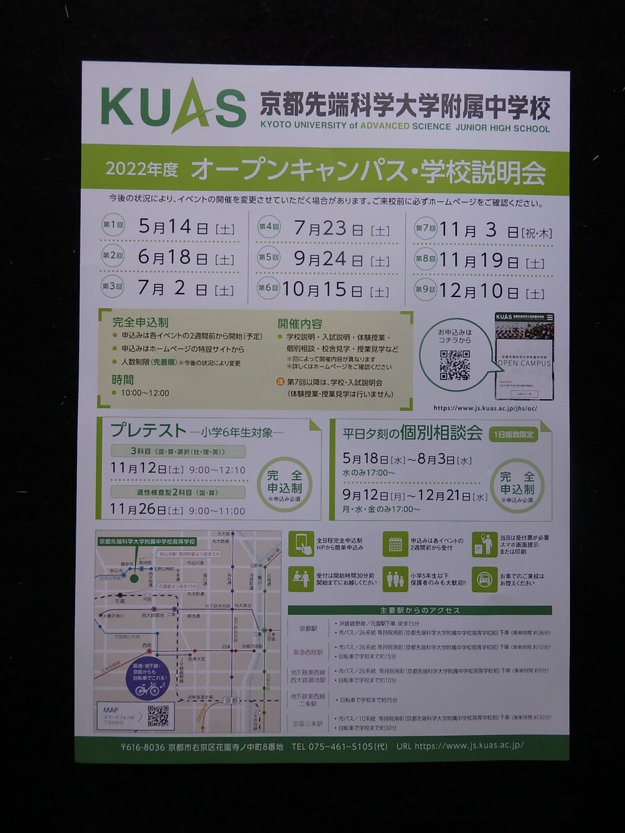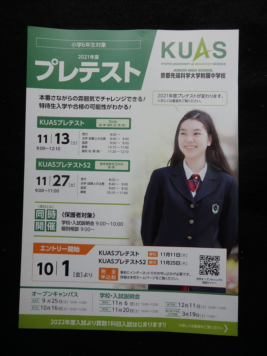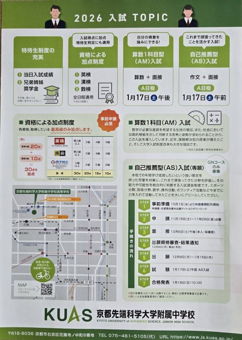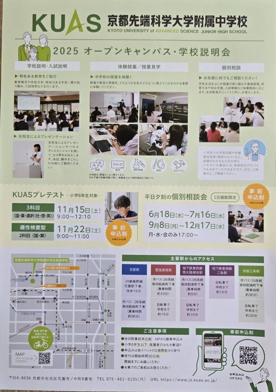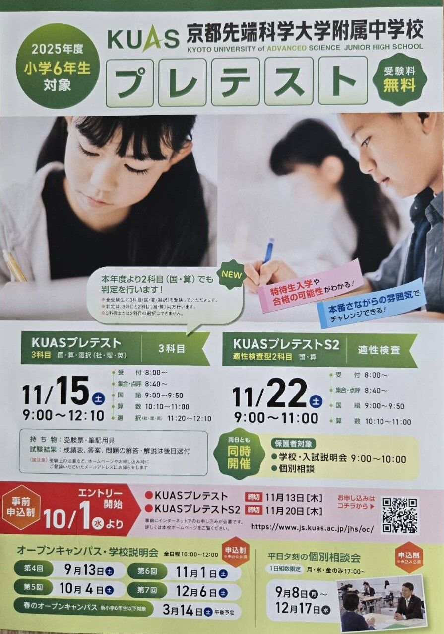 京都市右京区にあります「京都先端科学大学附属中学校」産kら、2025年11月15日(土)、22日(土)実施予定「2025年度小学6年生対象 受験料無料 プレテスト」案内を頂戴しましたので、紹介します。