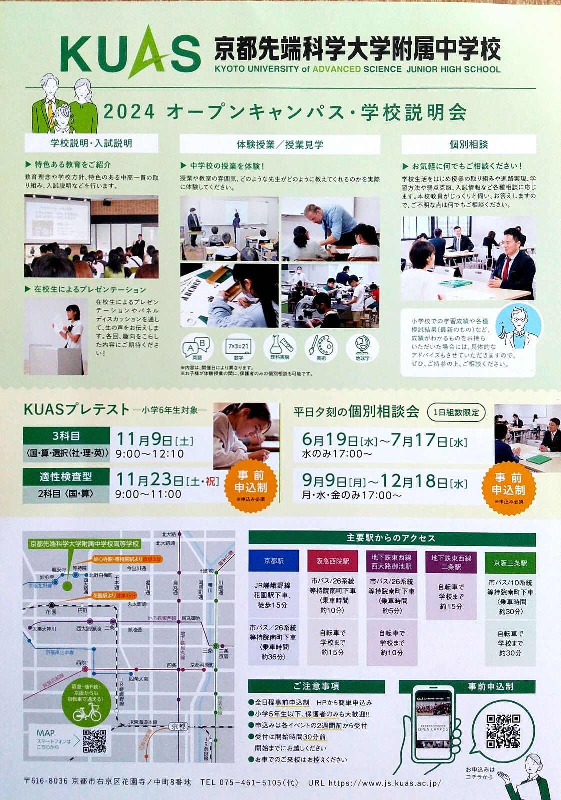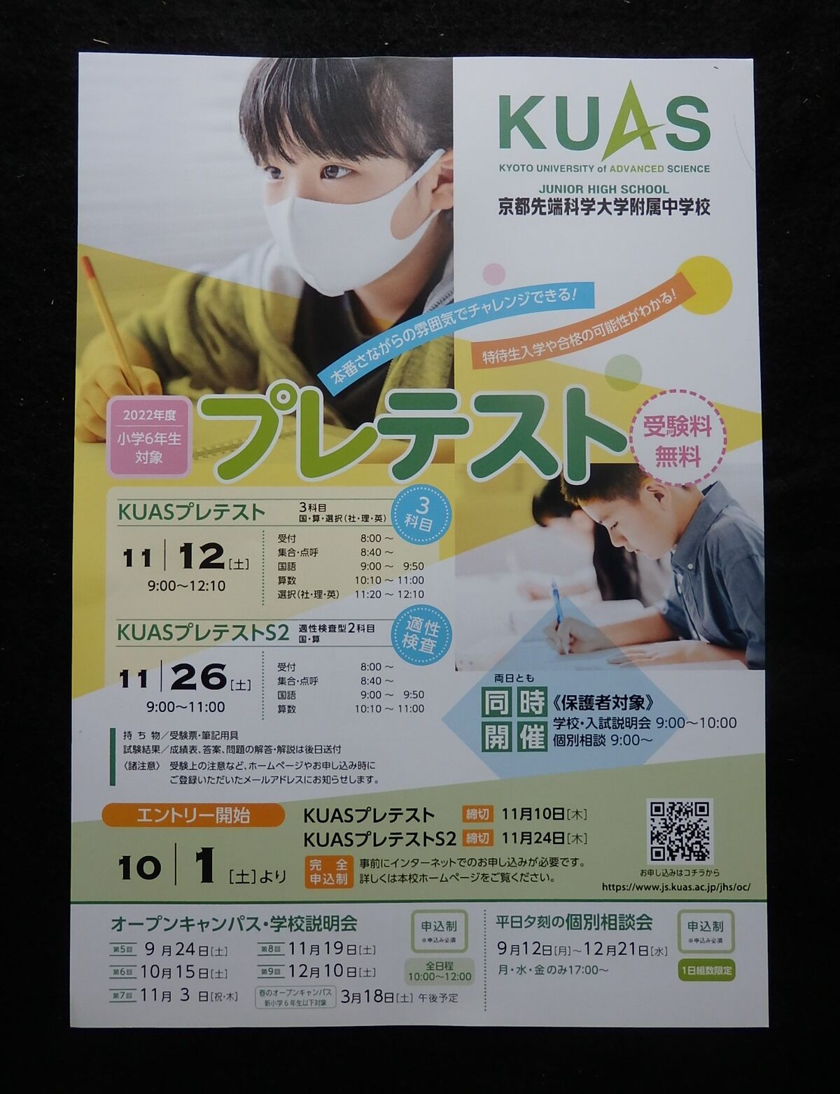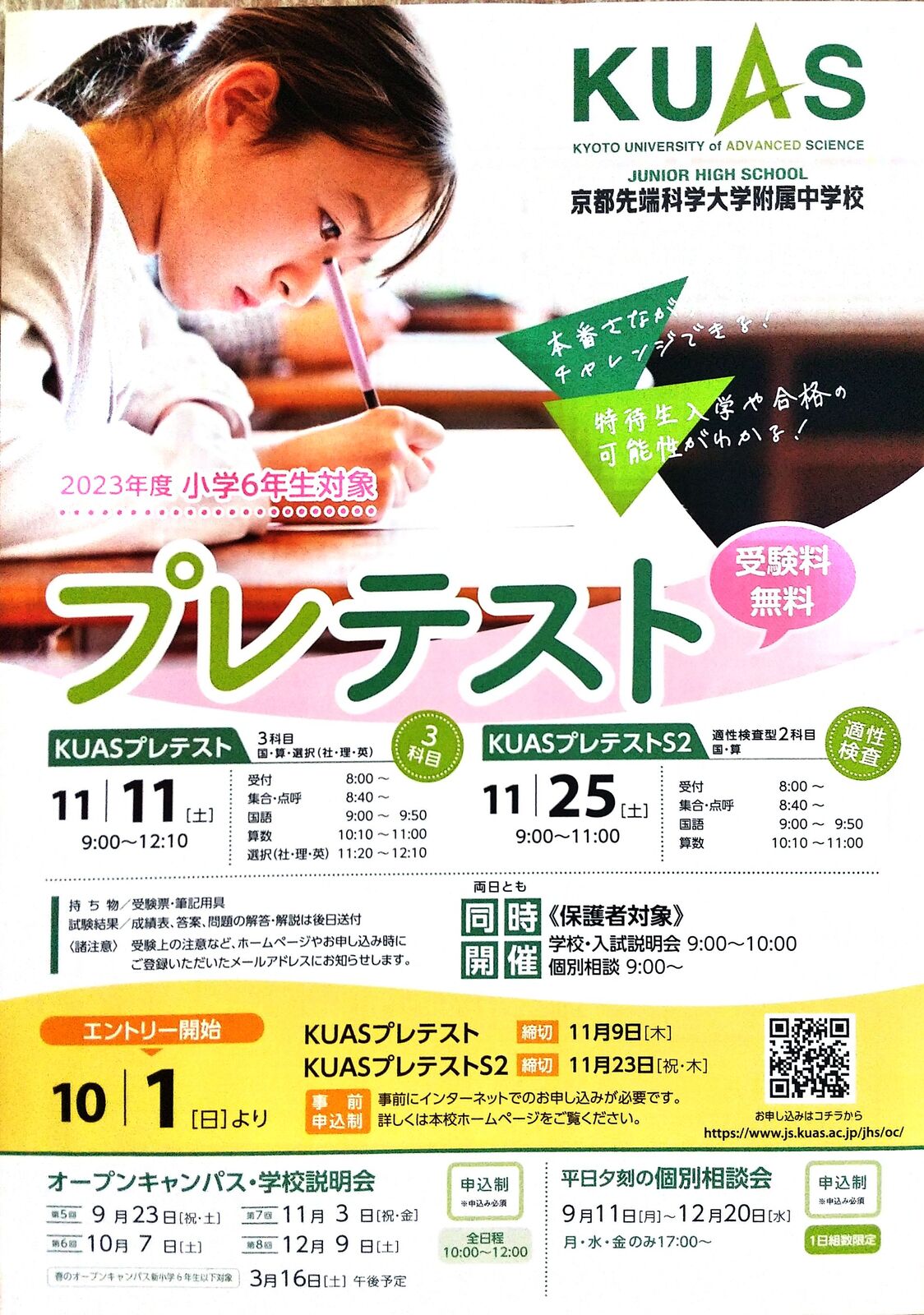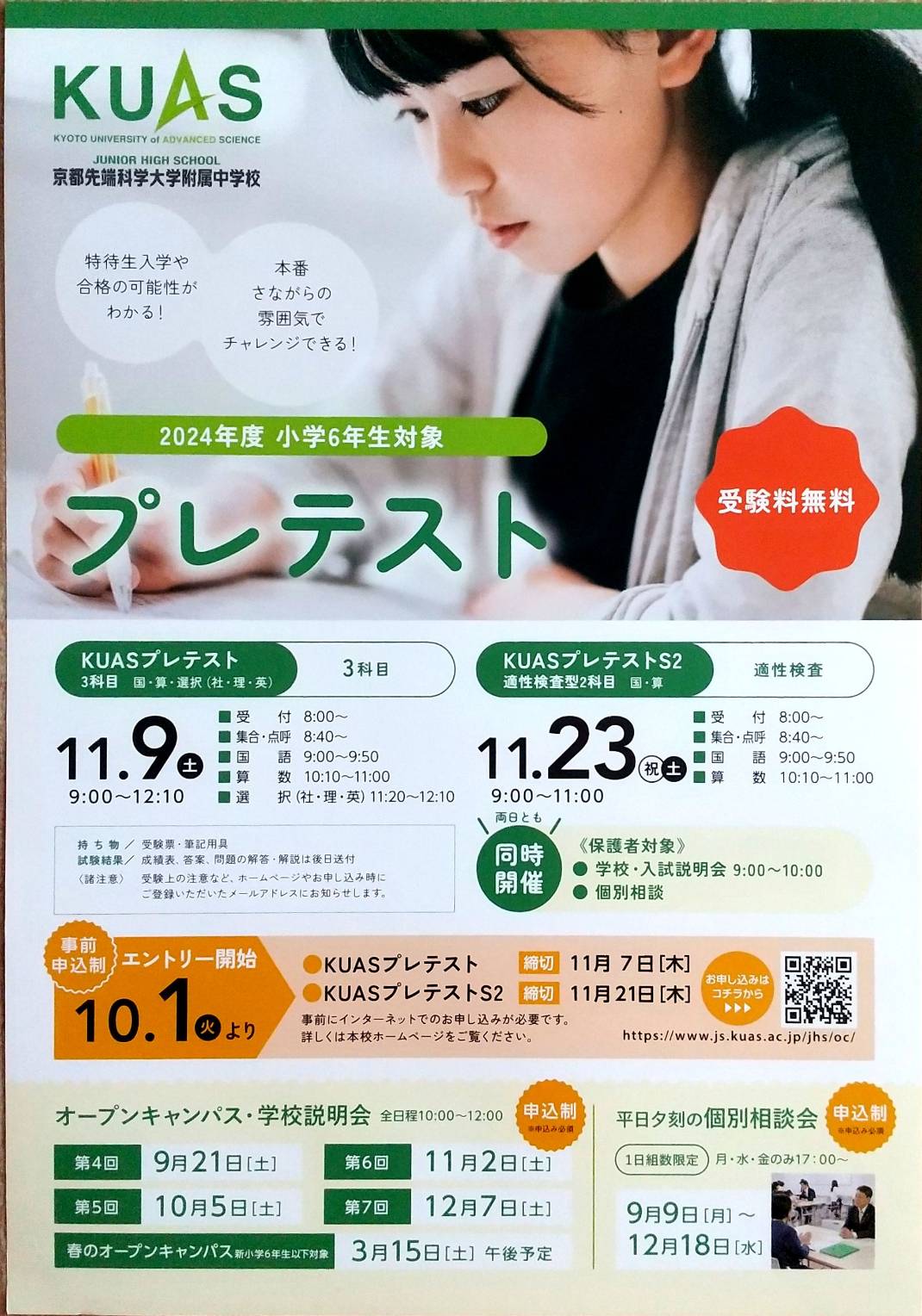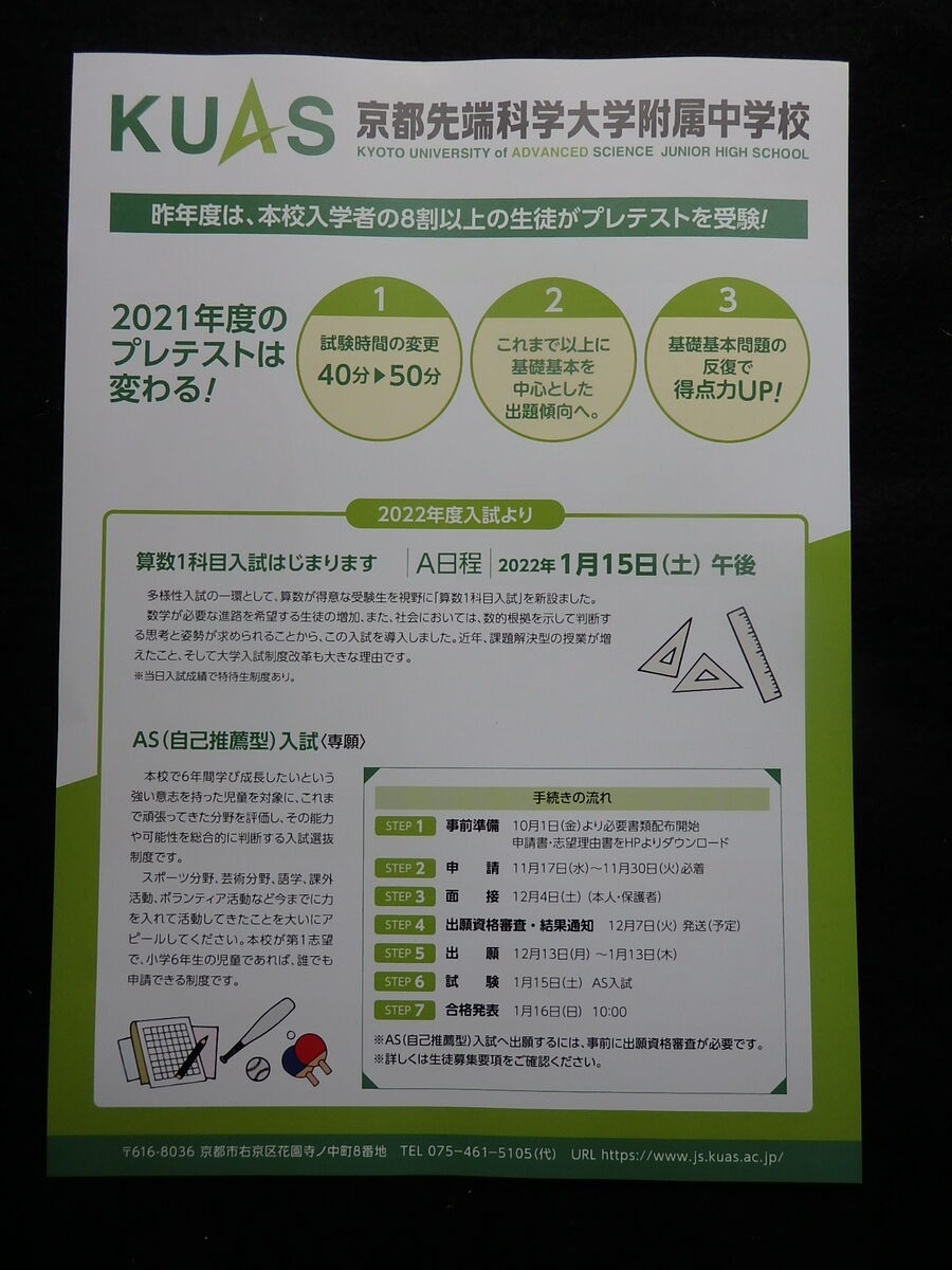 京都市右京区にあります「京都先端科学大学附属中学校」産kら、2025年11月15日(土)、22日(土)実施予定「2025年度小学6年生対象 受験料無料 プレテスト」案内を頂戴しましたので、紹介します。