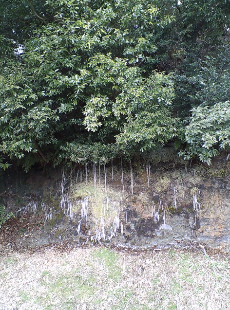 岩からちょろちょろ出ている水がつららの素になっているようです。