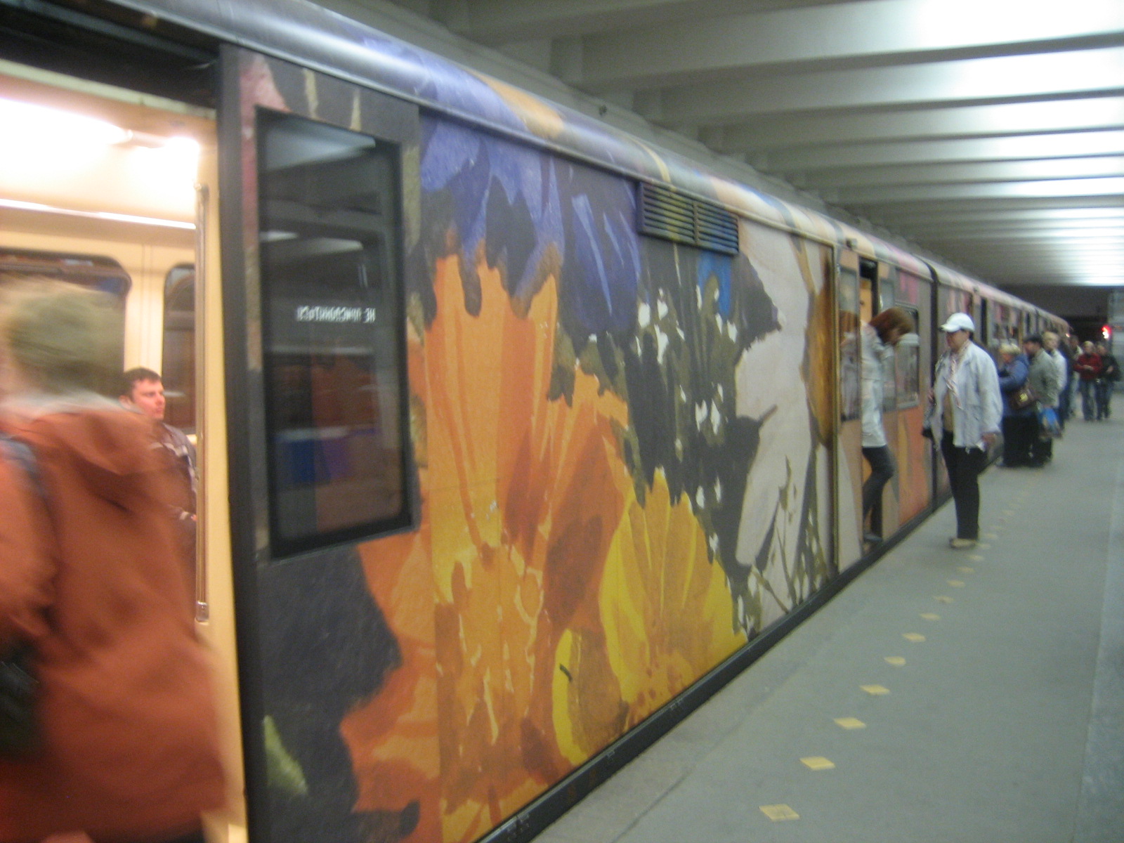 今年で開業から73年。高い天井にアンティークな照明が下がるいくつかの駅は一見に値するが、たいていの駅や車内は薄暗く、周りは険しい表情で押し黙った乗客ばかり。車内も殺風景で、とても快適な乗り物とはいえない。そんな中で、昨年6月から走り始めた「美術館」は一服の清涼剤だ。