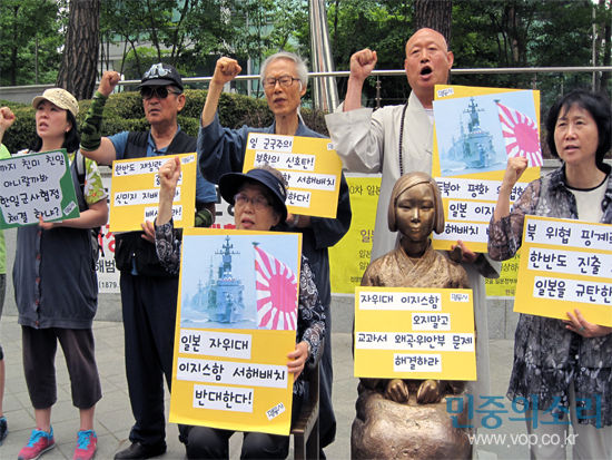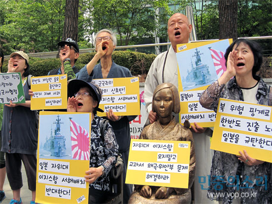 駐韓日本大使館前で記者会見を行い「東北アジアの軍事的緊張感を高める日本自衛隊イージス