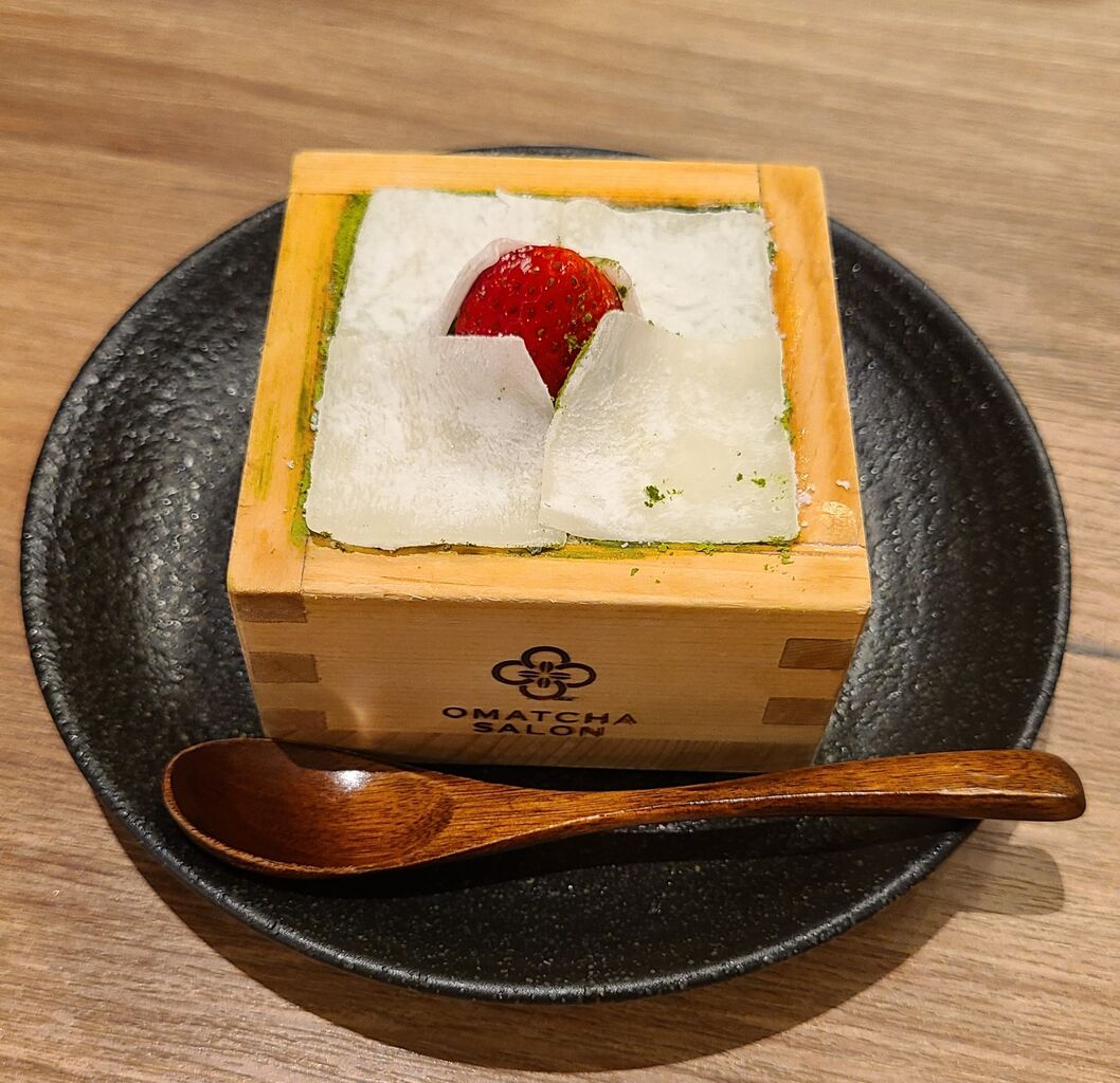上に薄い大福生地といちご🍓が乗っている抹茶ティラミスです!