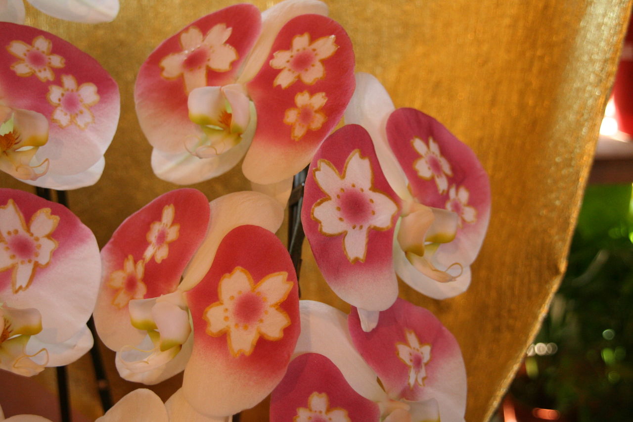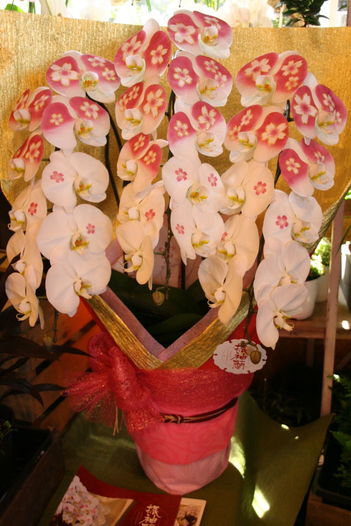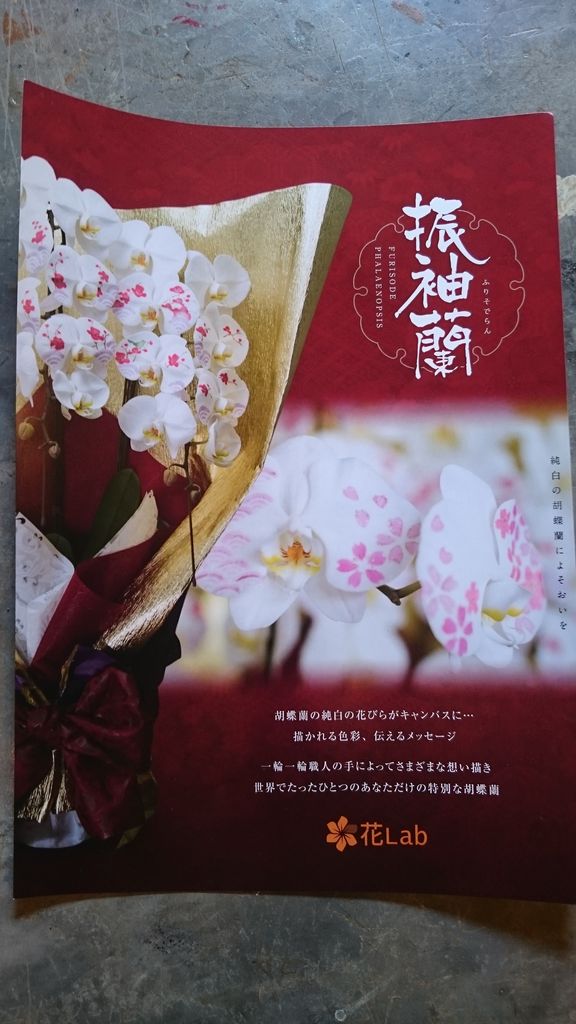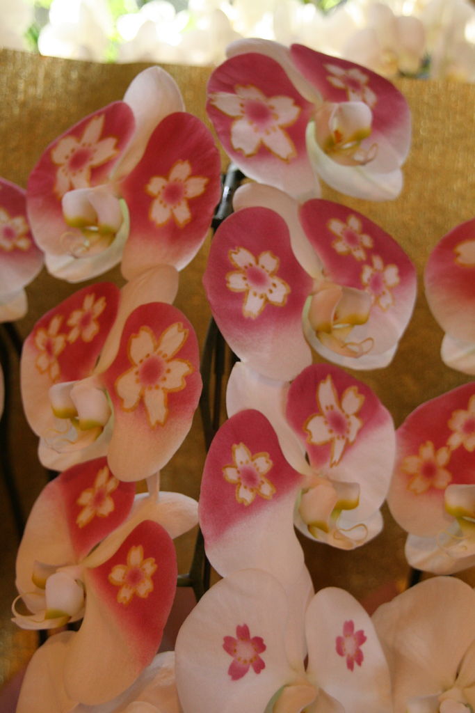 純白の胡蝶蘭に、一輪一輪職人さんによって模様が描かれた「振袖蘭」です。