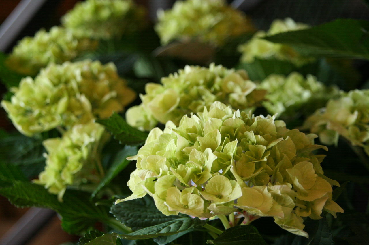 緑から白へと花色が変化していくアジサイです