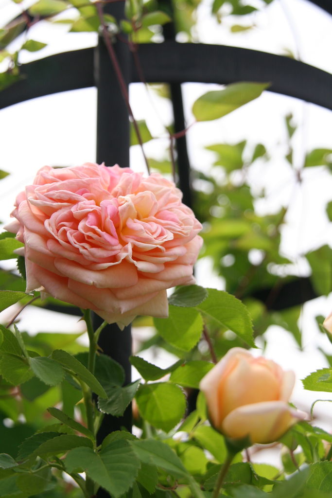 GREENテラスのオベリスクに誘引してあるつるバラが咲き始めました!