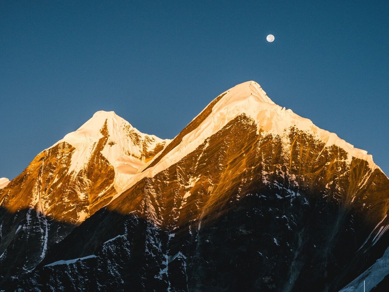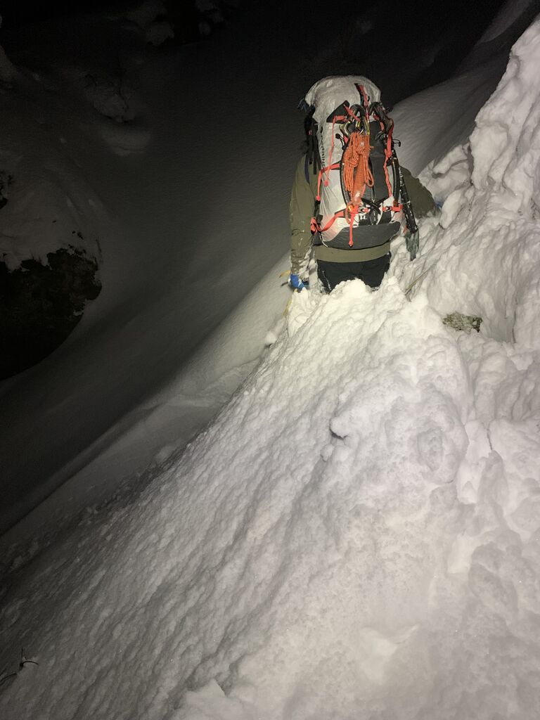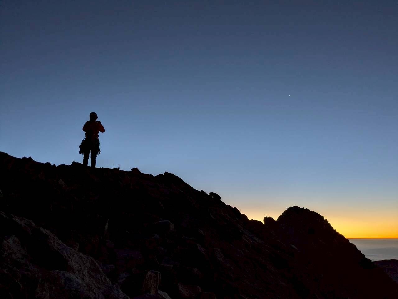 10月19日、朝1:30に起床、3:30にハイキャンプを出発した。ちょうど満月で、暗い中でも歩きやすい。アイゼンは心地よく雪面に刺さる。周囲の山の岩肌と満月が朝日に照らされ、幻想的であった。