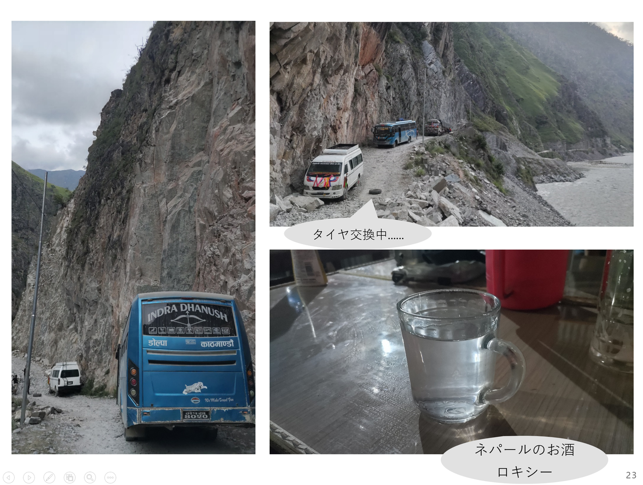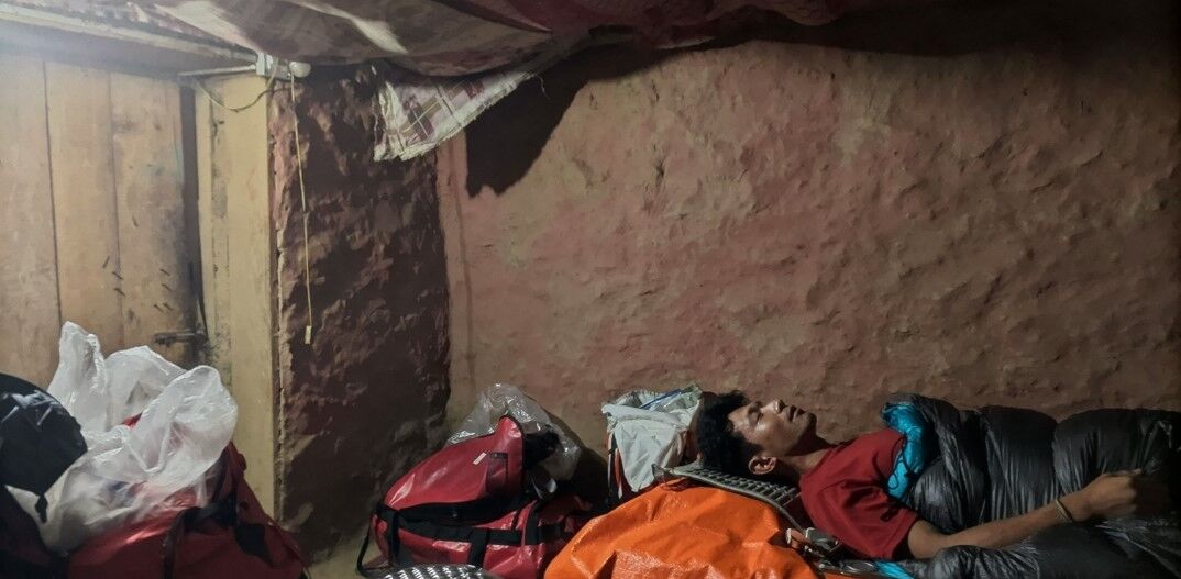 3日目は断崖絶壁に囲まれた谷底の道の中腹で日が暮れた。道は未舗装で、幅はバス1台分がギリギリ、街灯なんてない。暗くなってからの移動は困難だ。と思っていたら、突然集落が現れ、宿を取ることができた。「世界ふしぎ発見!」で出てきそうな、穴倉のような土壁の宿だった。そこではロキシーというネパールの地酒を楽しめた。まさに旅という風情で、僕の中では楽しい思い出だが、花谷さんはダニに食われて遠征中ずっと苦しむこととなった。