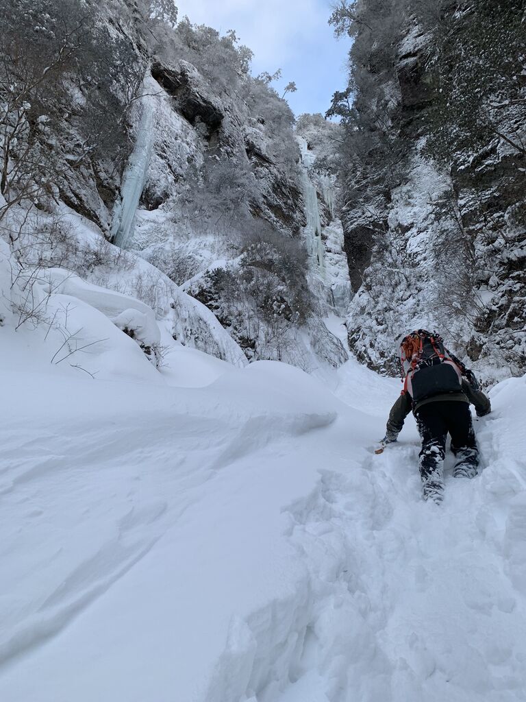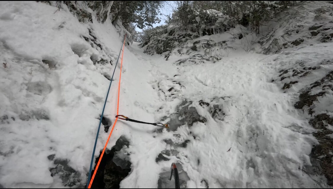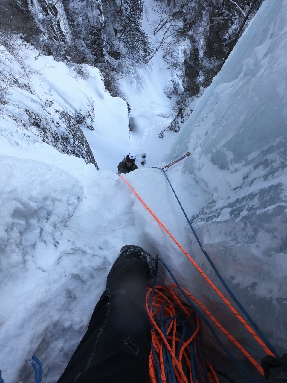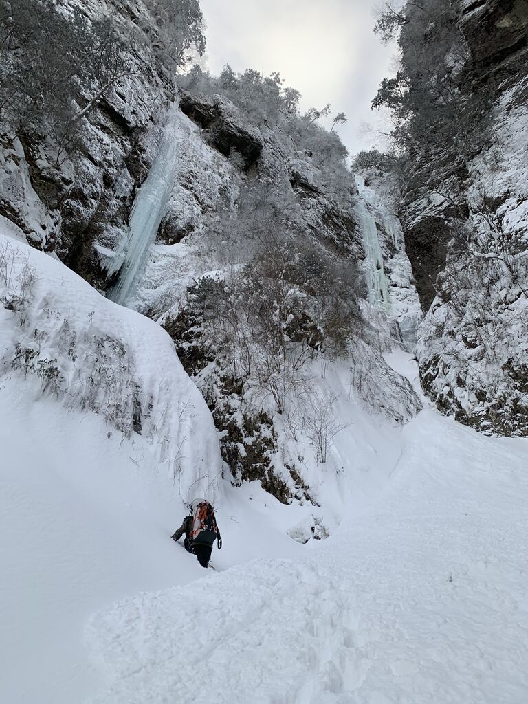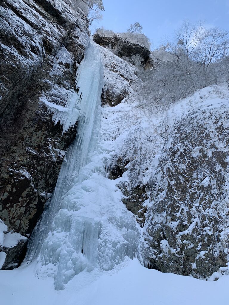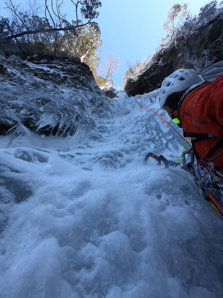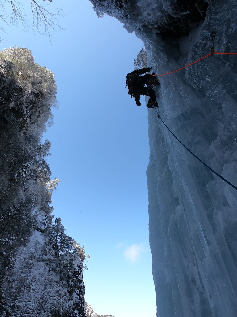 雄大がとても格好良い写真を撮ってくれたが、これは奇跡の一枚で、この後すぐ落ちた。でもいつかこのハングした氷も登れるようになりたい。