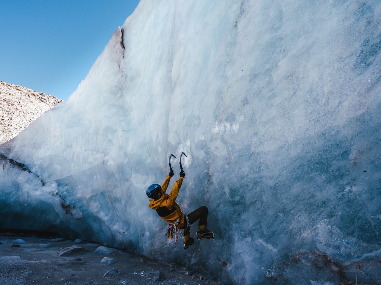 近くのモレーンを探検していると、池のようなものがあった。淵は氷河の壁で、前傾していた。アイスクライミングできるのでは?と取りついてみた。