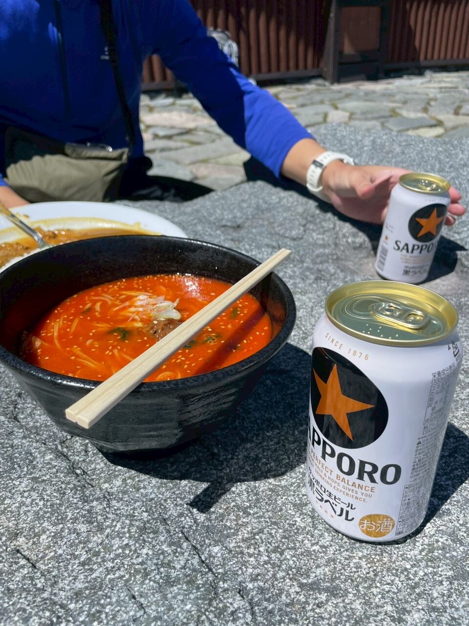 途中で子供連れの4人家族も追いついてきて、一緒に降った。酔っ払いが近道を案内してくれたおかげで、無事先行して待っていたメンバーにも追いつけた。