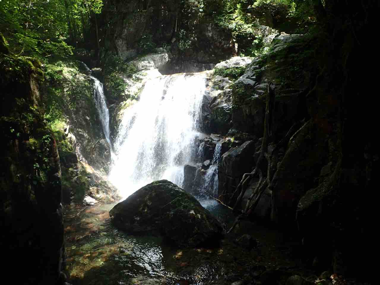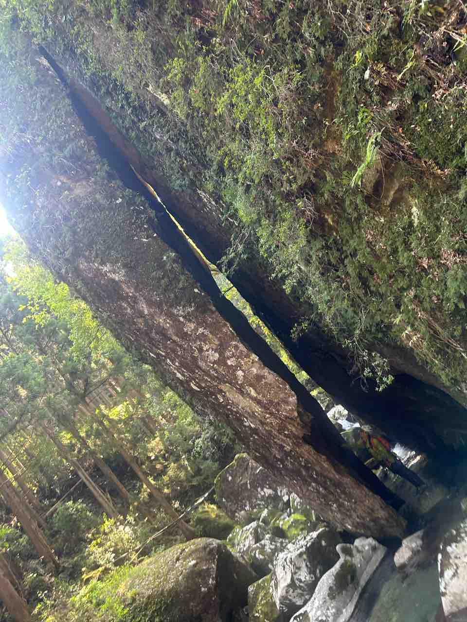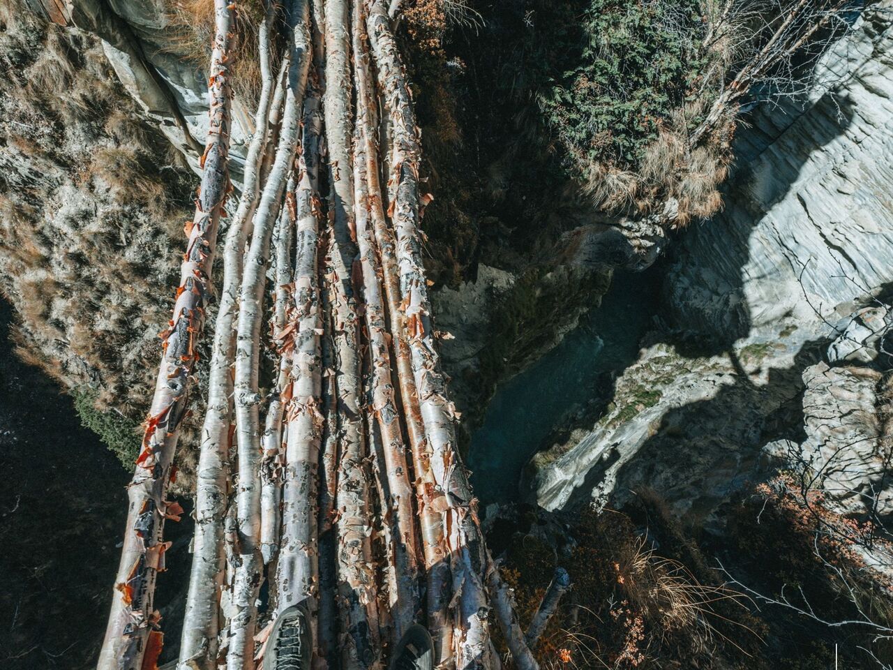 帰りはもちろん行きと同じ、気の抜けない道を帰る。途中には、深さ100mはある谷に、ダケカンバの枝を数本渡しただけの橋もある。一体誰がどうやってかけたのだろうか。
