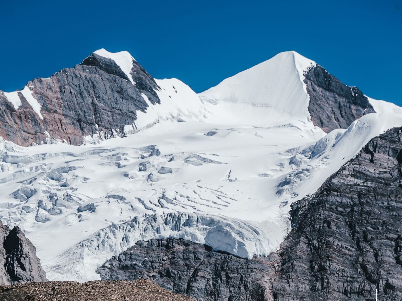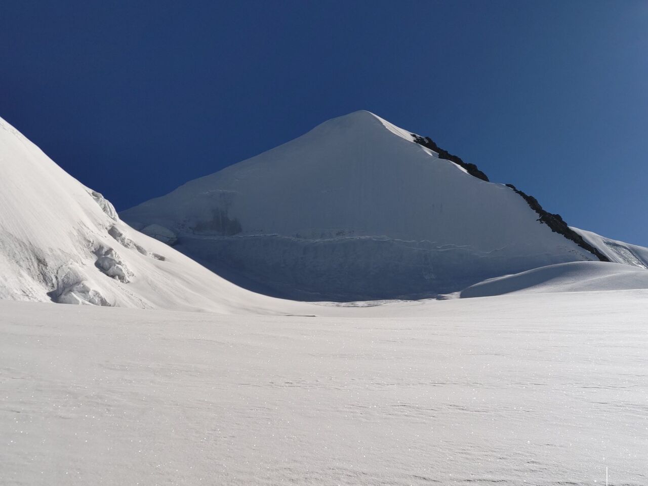 過去の写真よりクレバス(氷河の裂け目)が多く見えた。それでも登頂の可能性は感じられる。5200mにハイキャンプを設け、そこを拠点に網目のようなクレバス帯を超えるルートを確立した。