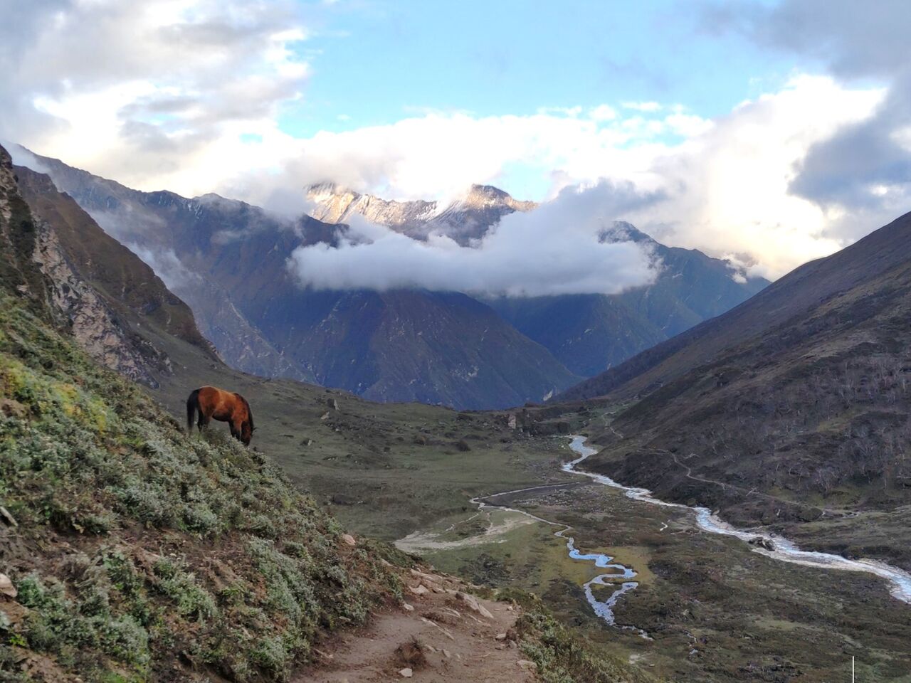 キャラバンが始まって2日目、ガウチャー(標高3900m)という風光明媚な場所でテント泊をした。澄んだ小川が流れる広い谷に、馬やヤクが放牧されている。木も人もない。