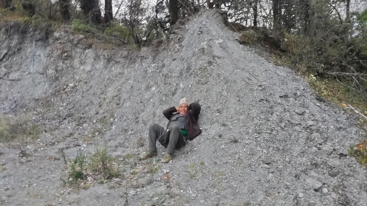 しかし松葉杖状態では歩みは遅く、最後の村まで残り標高差400mの下りを残して途中で日が暮れた。僕と、僕に付き添ってくれた雄大と2人を残して、他のメンバーは先へ行った。暗い山中で逸れたことに多少危機感が募ってきた時、道で気持ちよさそうに寝っ転がっている人がいた。