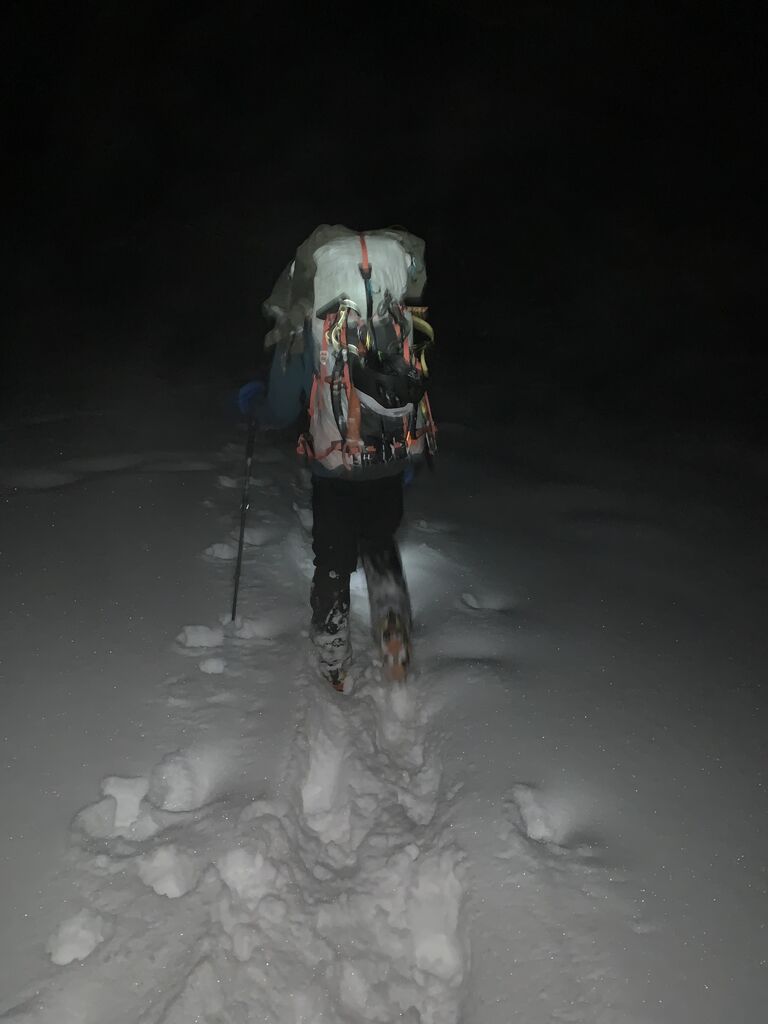 ベースキャンプまでの道はモレーンという特徴のないガレ場がずっと続く。おまけに細かい起伏もある。その中でも道を見失わないよう、往路でピンクテープを岩に巻いていた。しかし既に日没。辺りはどんどん暗くなり、目印は分からない。おまけに予報通り吹雪いてきた。5000m地点でついに完全に進む方向が分からなくなった。
