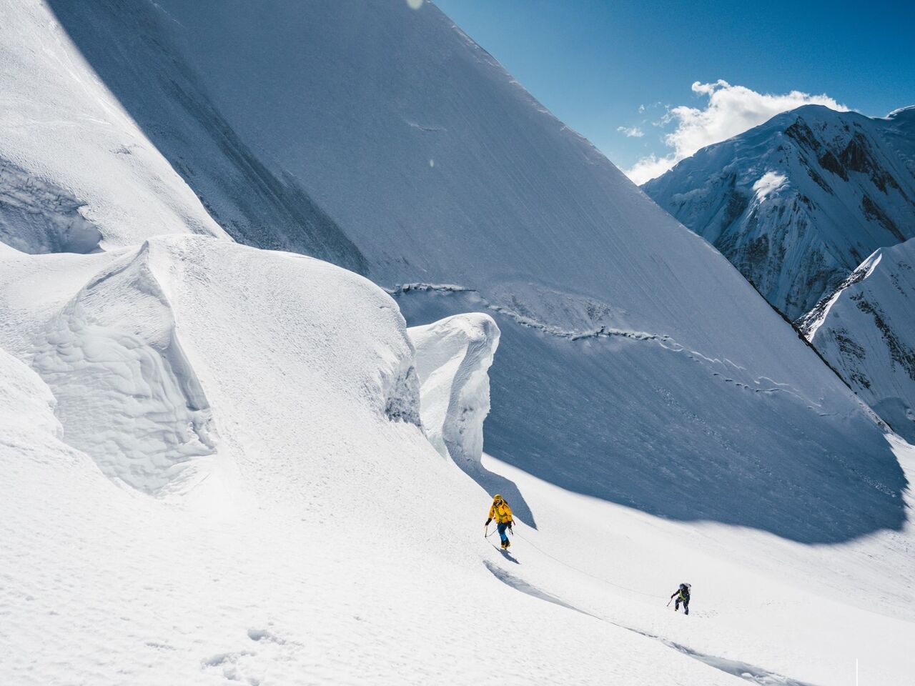 前日のルート工作により、順調にクレバス帯を超えることができた。未踏の雪面を歩くのは初めての経験で、気分が高揚した。