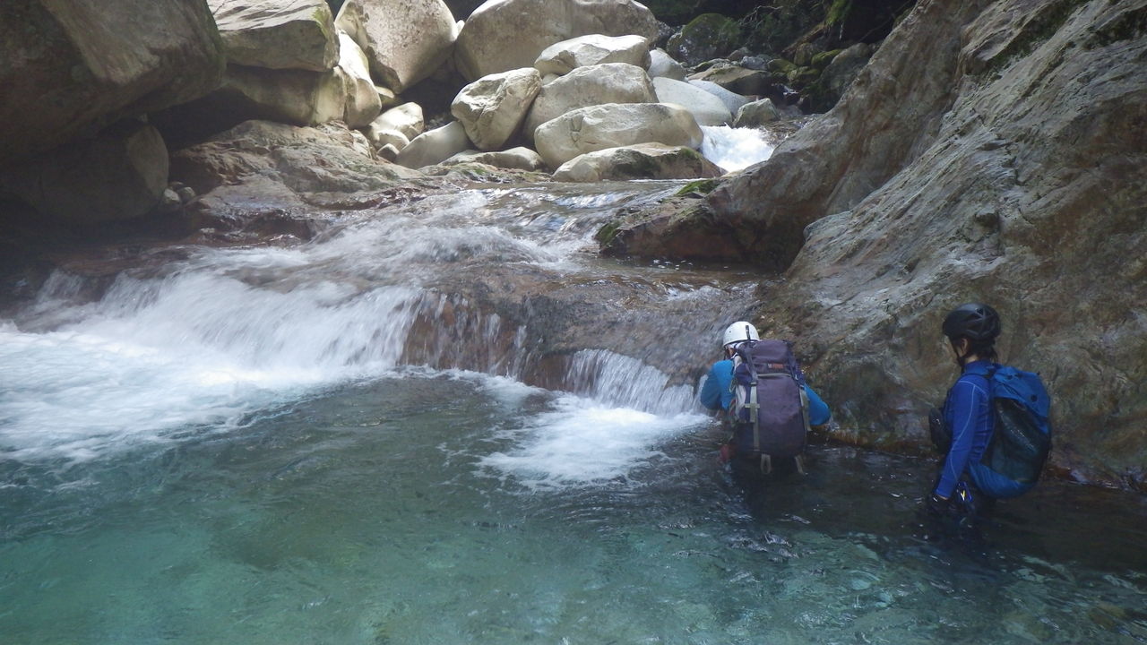 本流に合流する。川幅は広く、噂どおりの透明度だ。しかも出てくる滝全てが