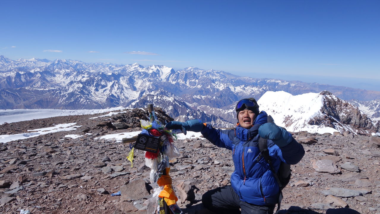 数歩進んではゼェゼェと息を切らしたまらずその場に座り込む、すると寒くて体がガクガクと震え始めるからまた登りだす。そんな気の遠くなるようなことを空が明るくなっても、左右の切れ落ちた雪の稜線でも必死で続けた、大晦日の朝11時、日本でいう夜11時、僕は6962m南米大陸で一番高いところに立っていた。宝箱があるわけでも何でもない。何もないただの岩の頂上。でもこのために全身全霊で集中してきたのだ。