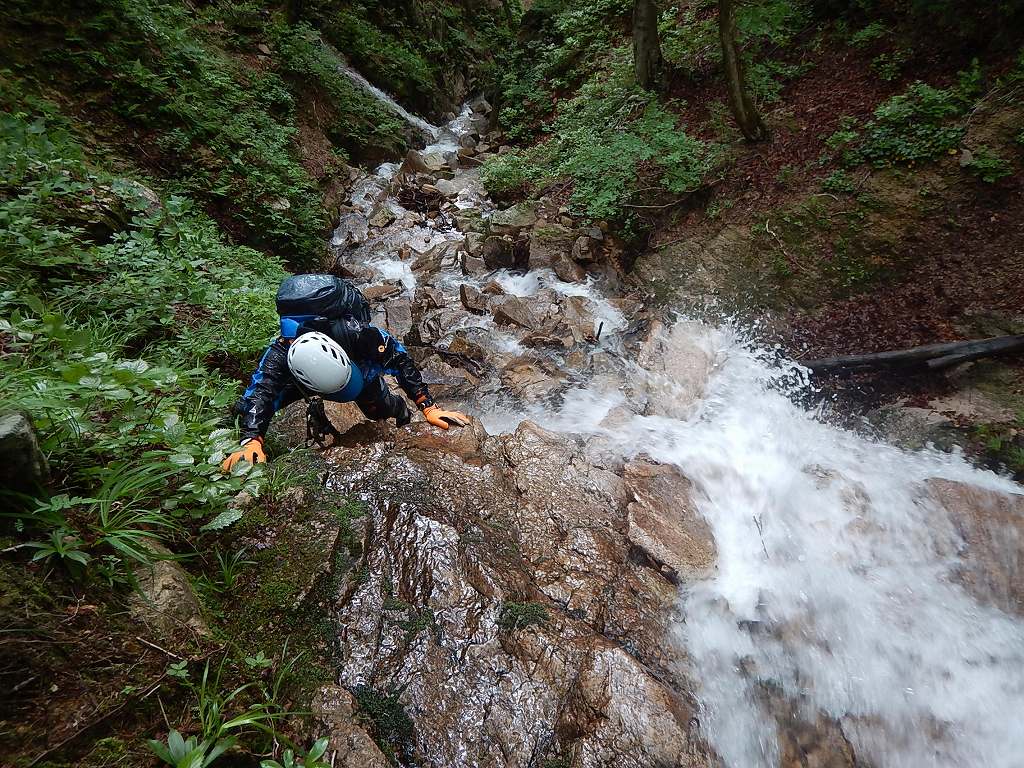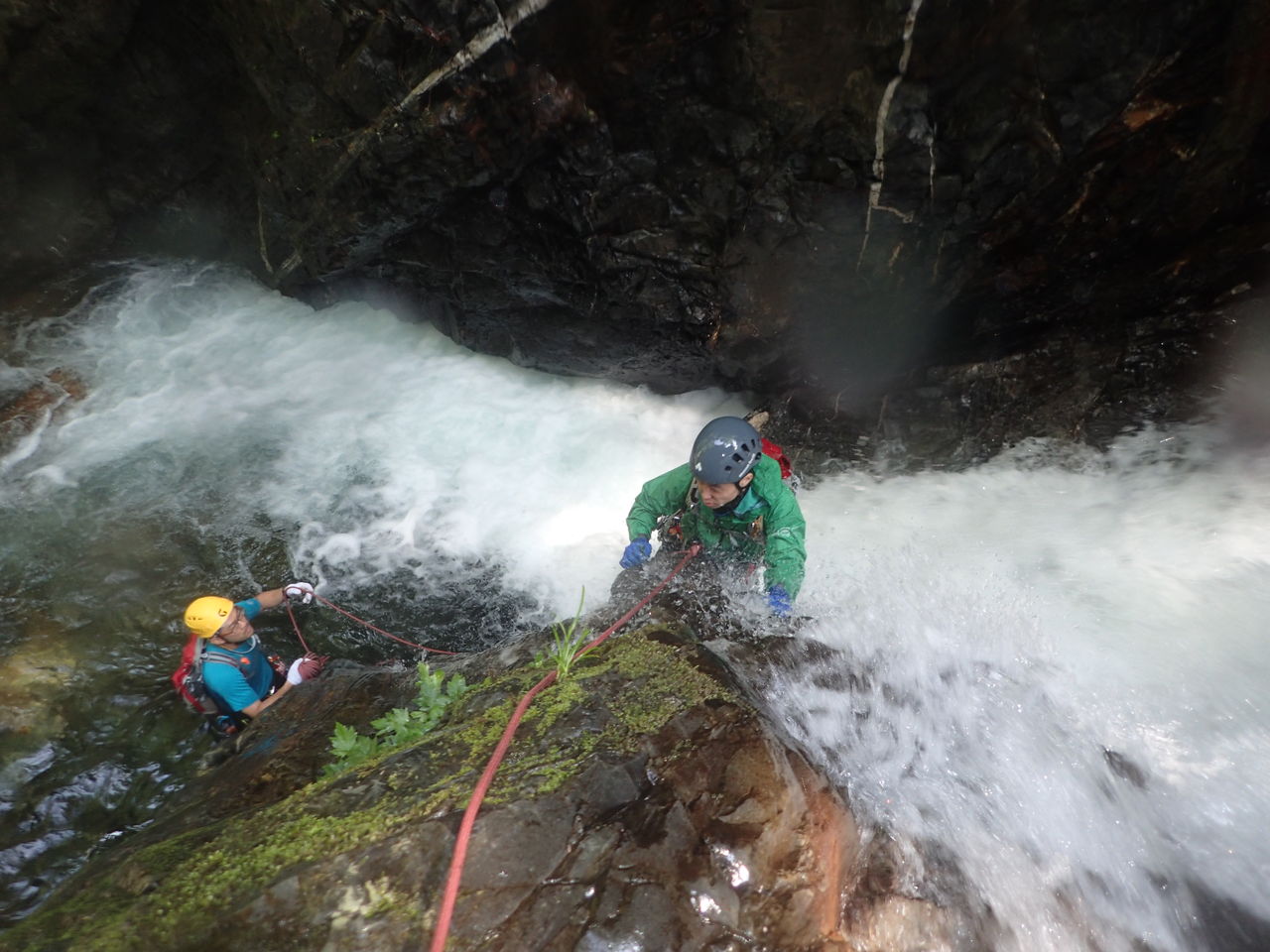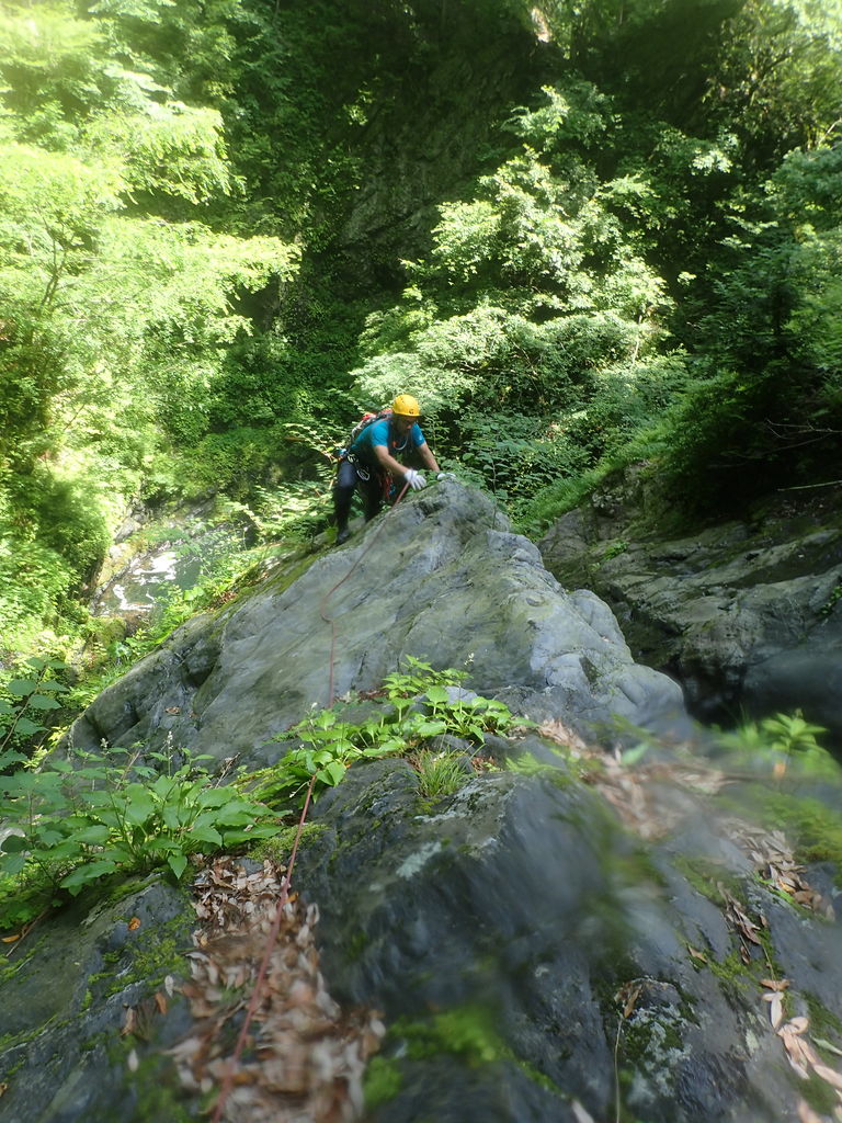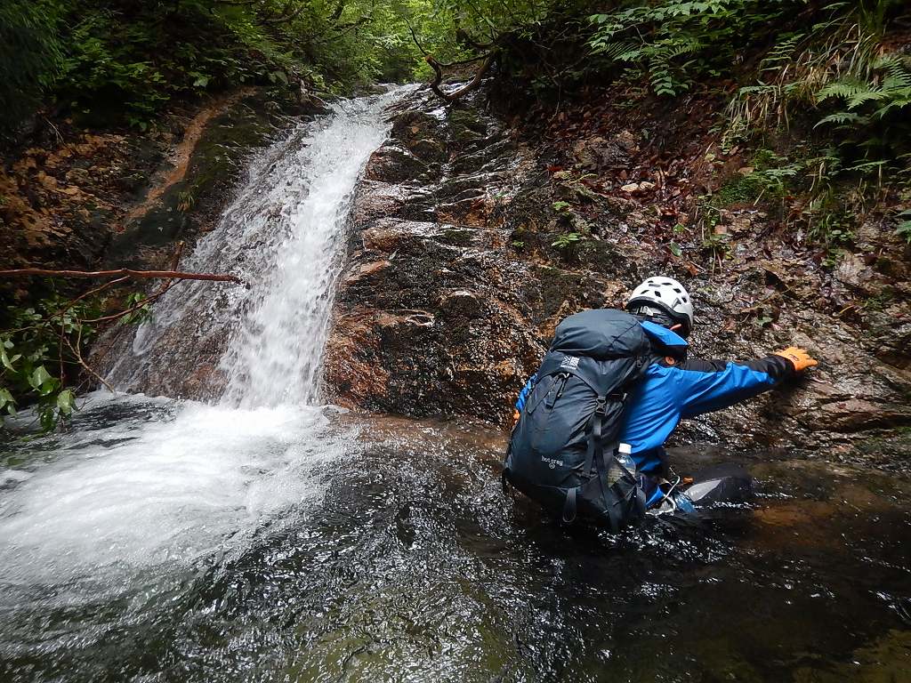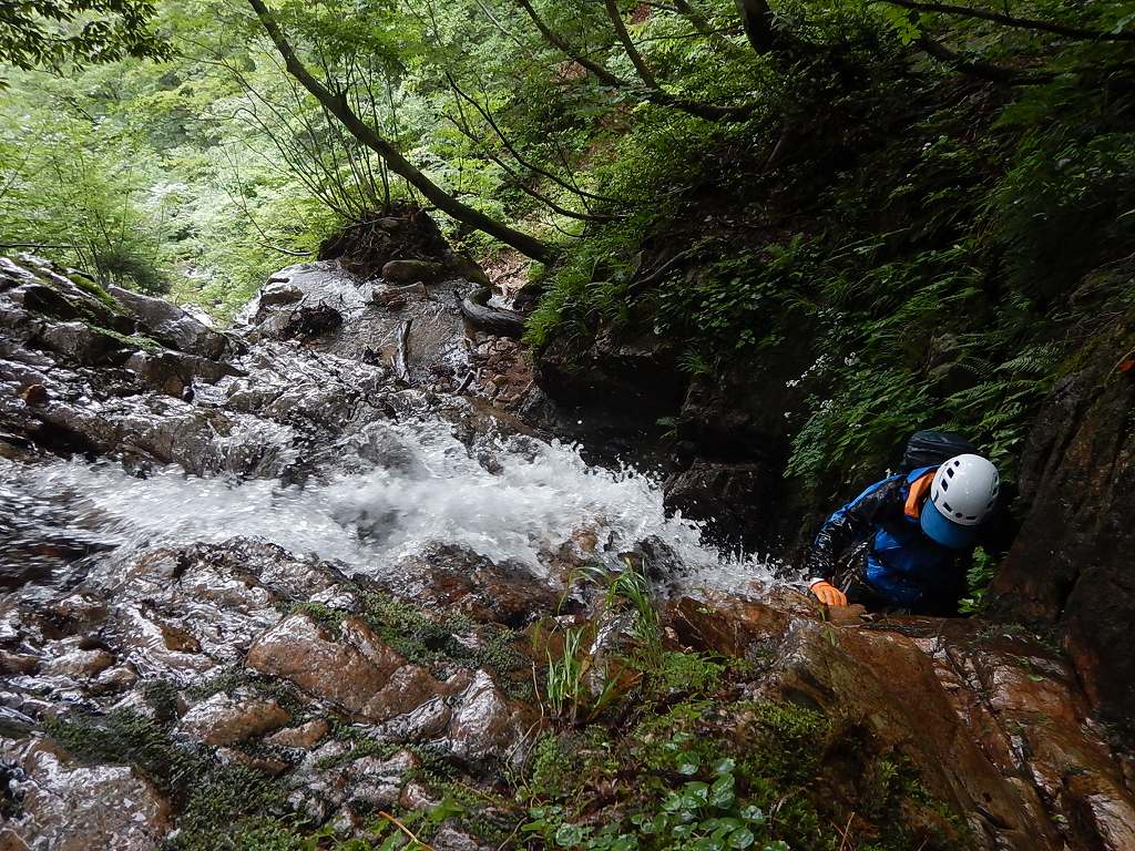 1段目から3段目まではどうということはないが、4段目の釜がなかなかの水量で渦巻いており、ここは渋いへつりで切り抜けた。