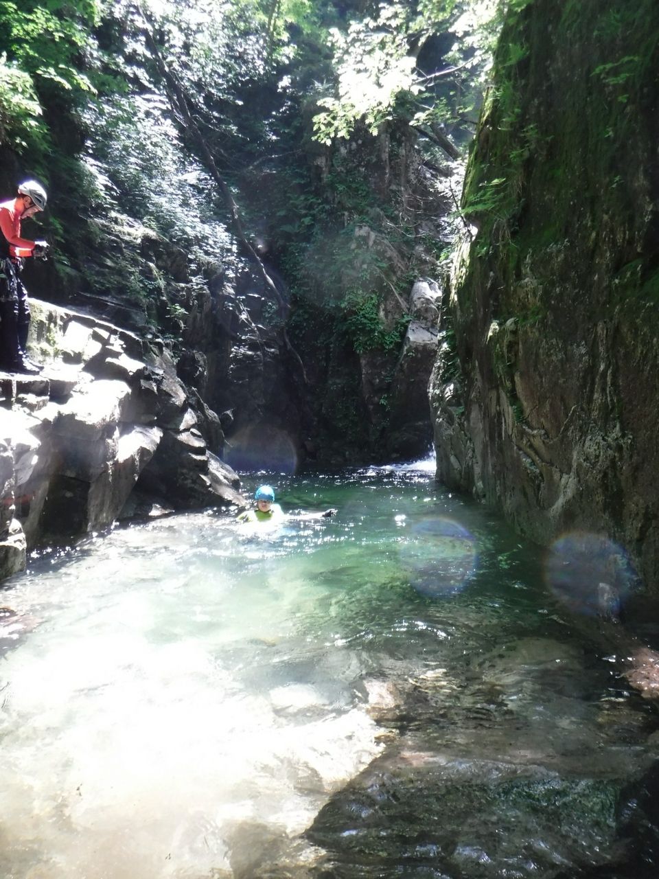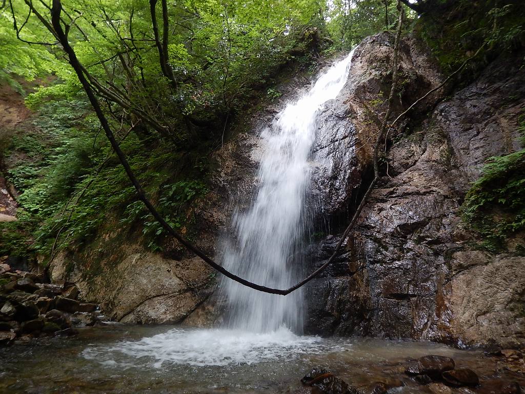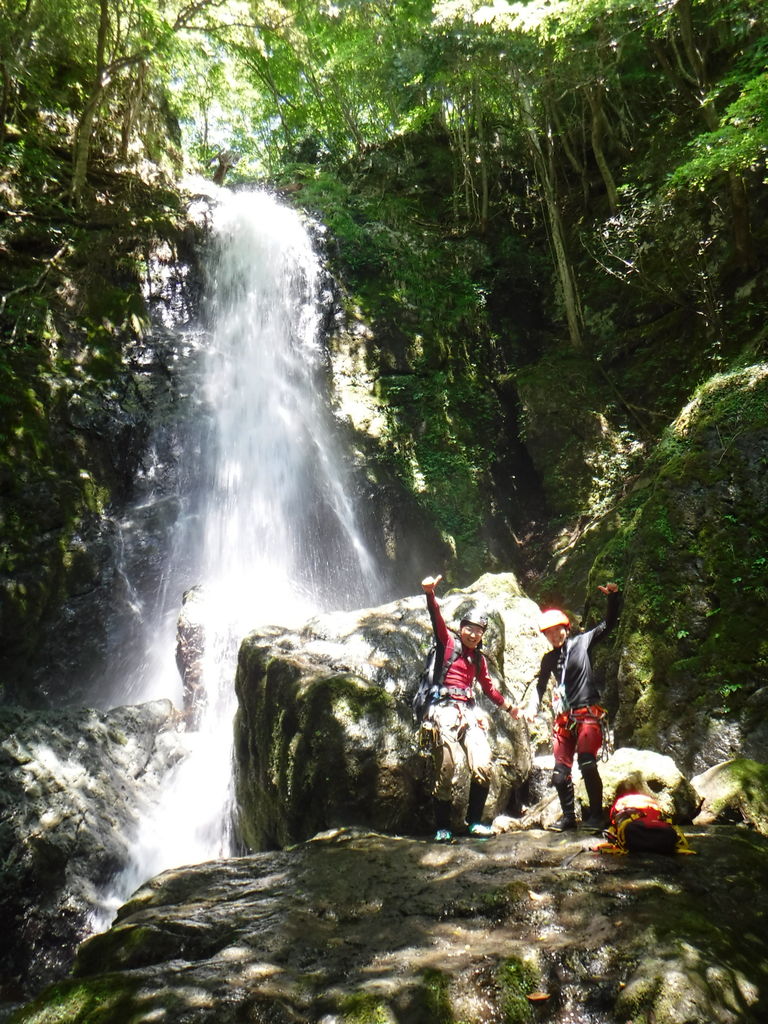 釜では恒例の飛び込み大会を開催し、きれいなナメ床を過ぎると登山道と交差、遡行終了となった。