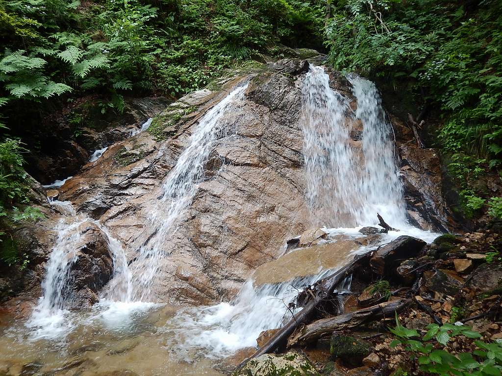 二ノ滝を超え、その先の小滝もこなすと沢は左に屈曲し、見えないその先は轟音と水煙・・・三の滝である。