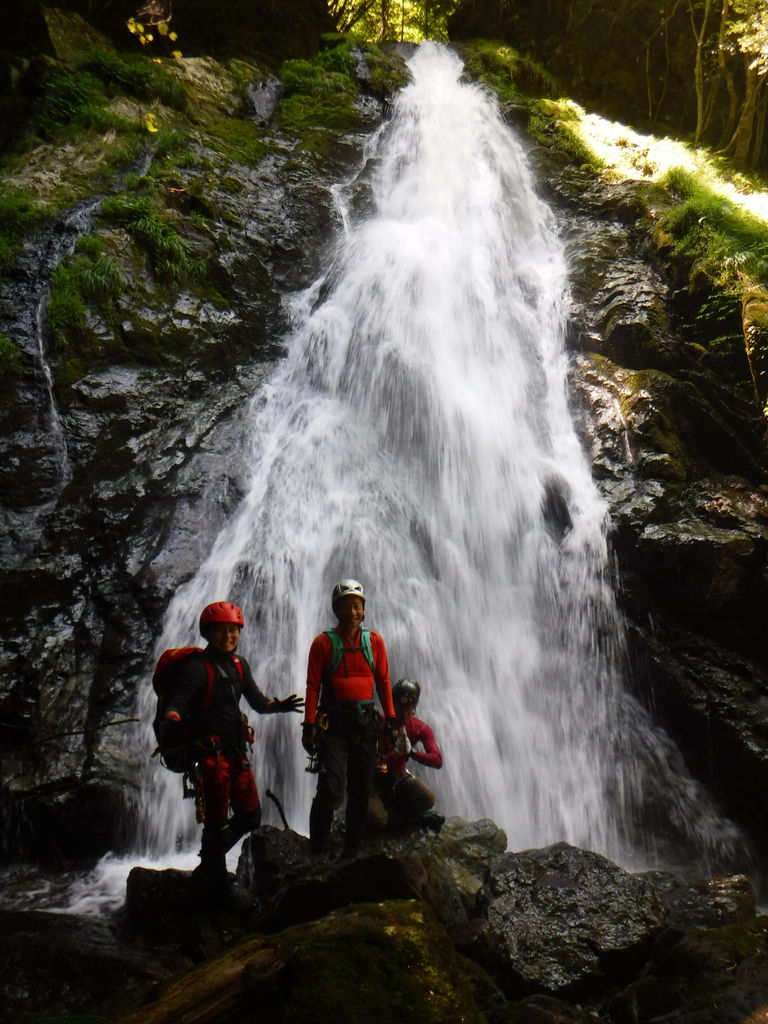 三の滝は滝裏からアプローチ、果たして水流に捕まらず抜けきることができるのか・・・意を決して滝裏に進入、ジリジリとトラバースで歩を進め、最後はスタンスを蹴って一気に滝を抜けた。