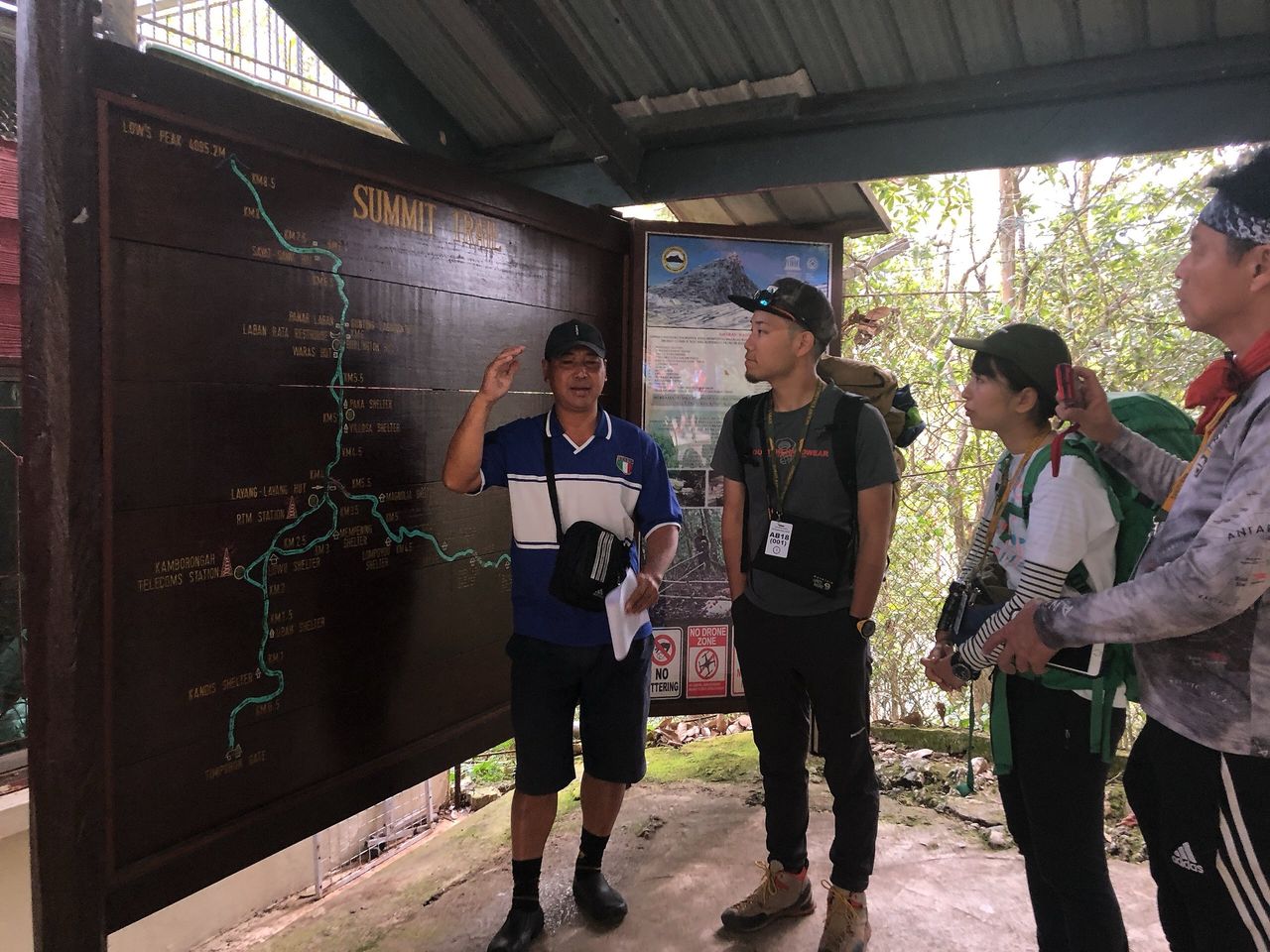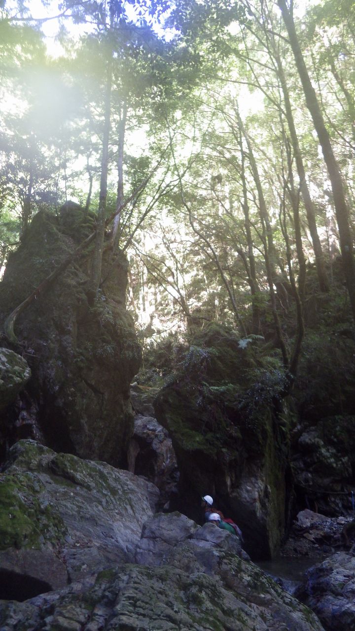 そんなこんなでワイワイと2時間半の登りで黒戸尾根登山道に出て、そこから4時間木漏れ日のそそぐ森を歩き、駐車場に到着。