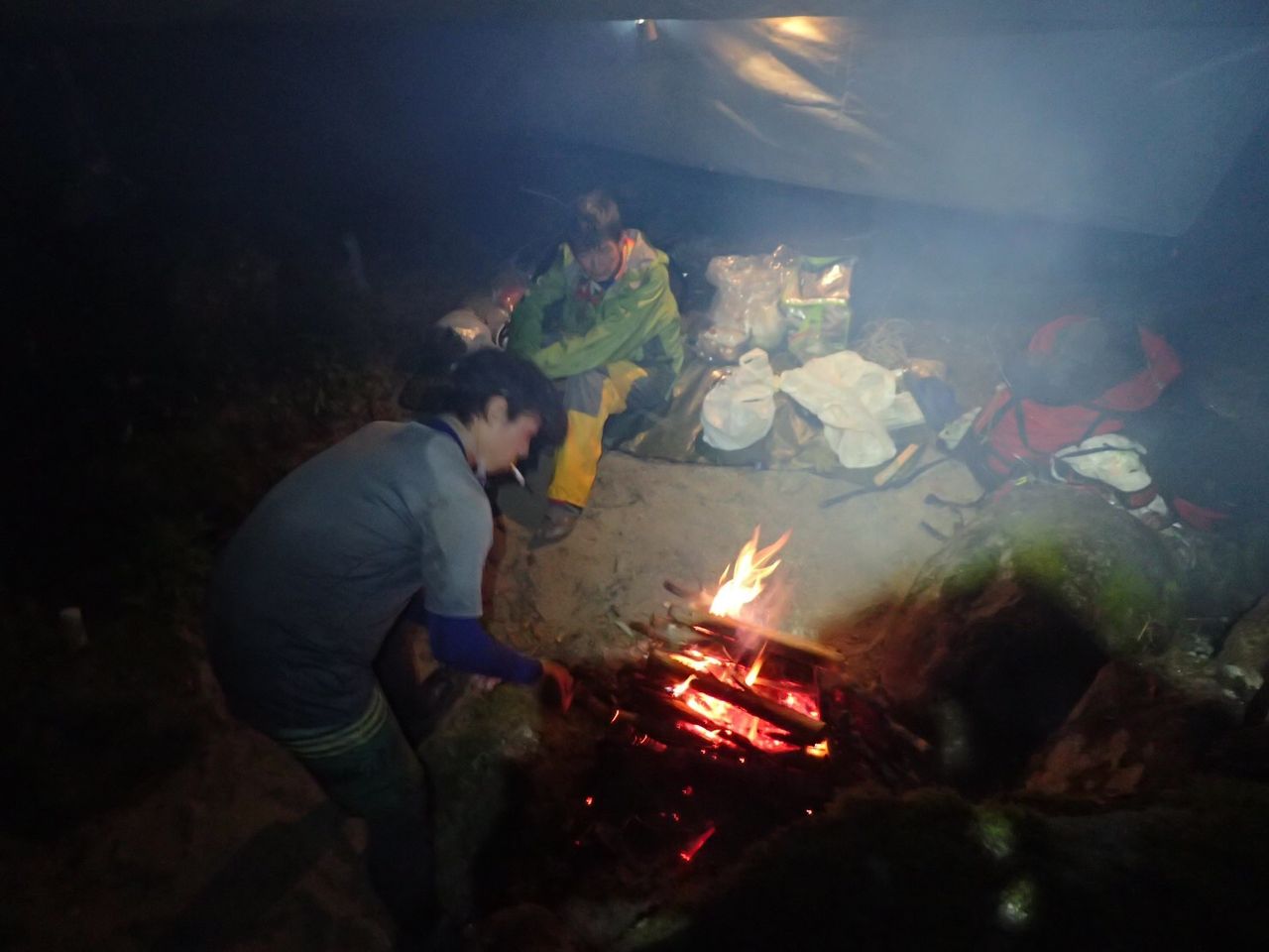 眼が覚めると、NさんとOKDさんが朝ごはんのための焚き火をしているところでした。
