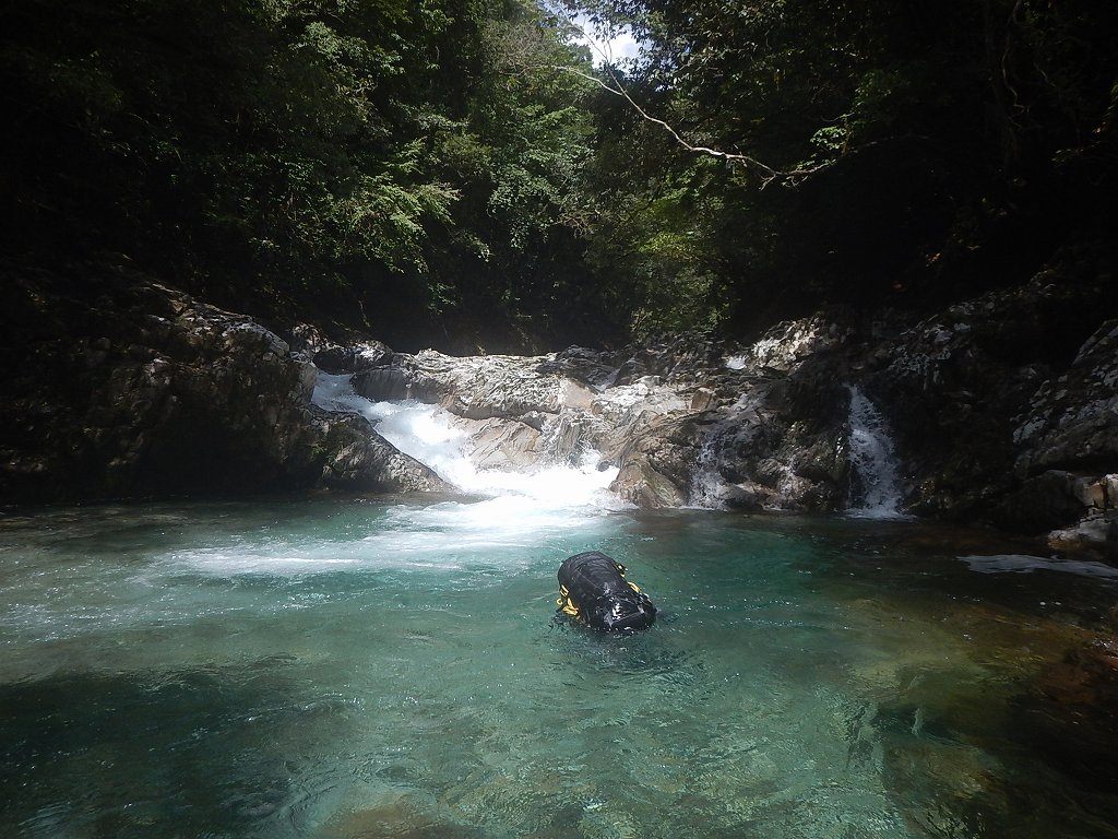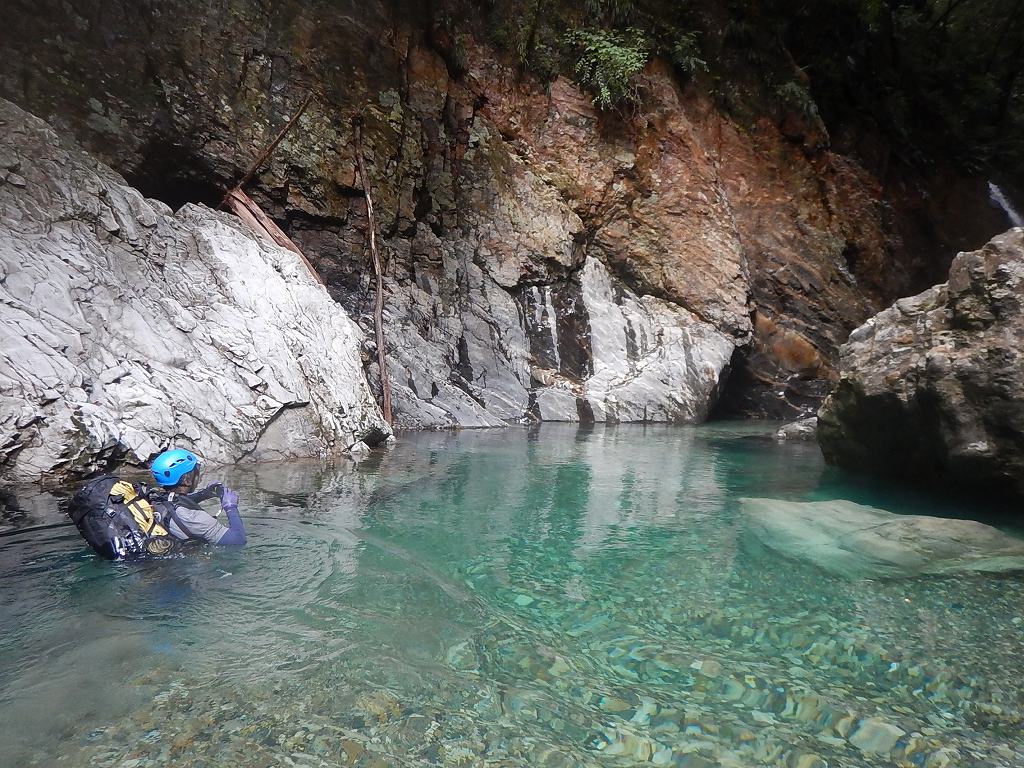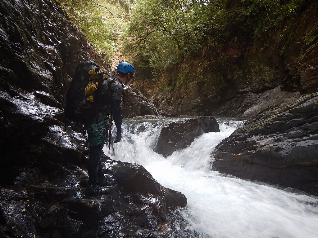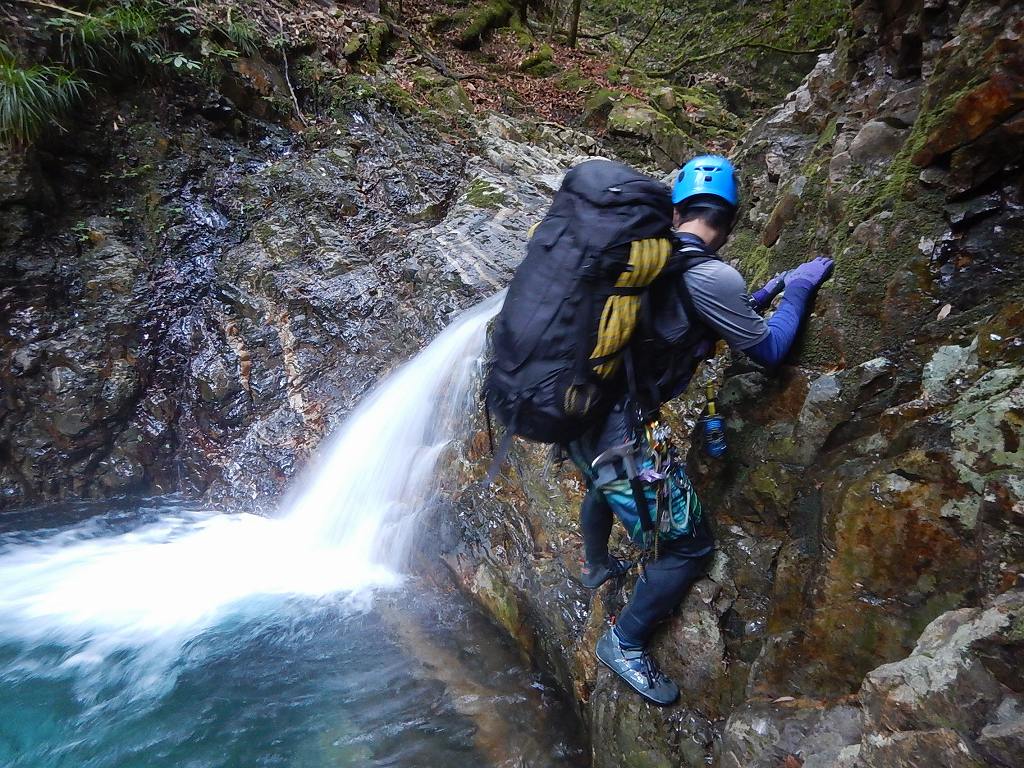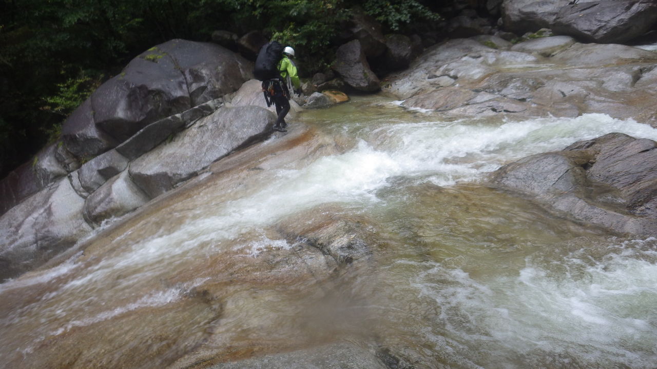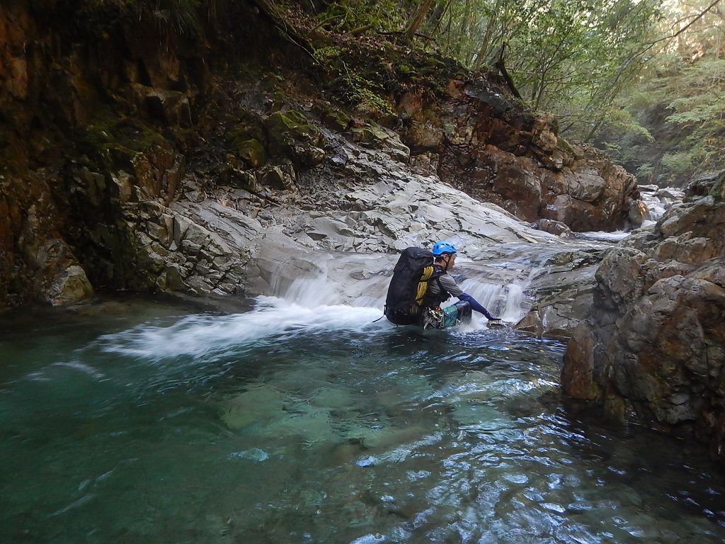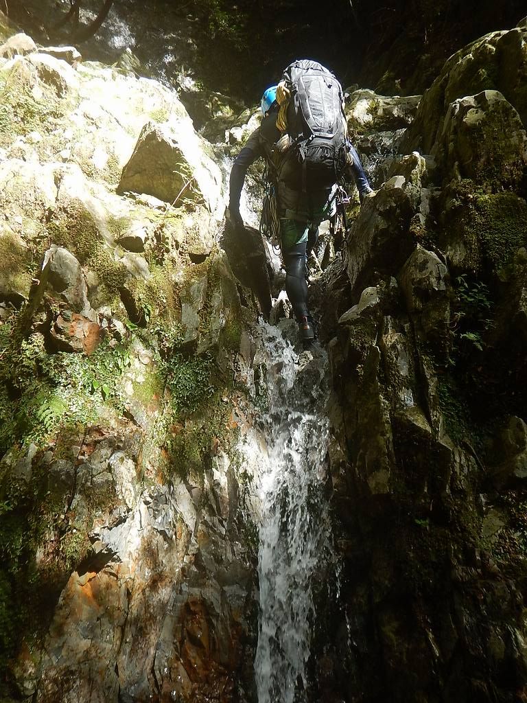 オートキャンプみたいな量の食料だ、、、と思いながら重荷を背負ってツルツルスラブの滝を登ったり巻いたり。良さげな釜や瀞があれば魚影を探す。