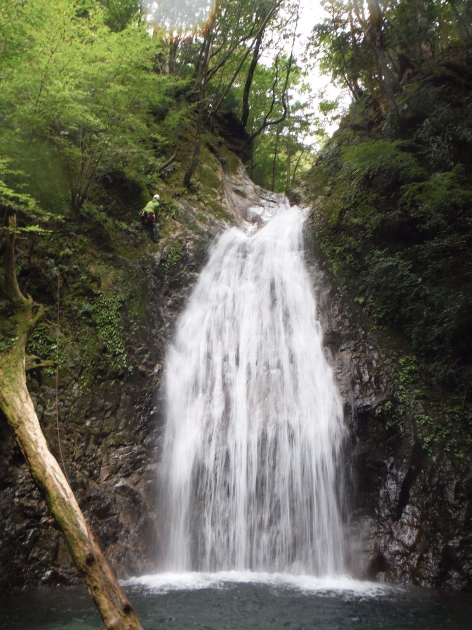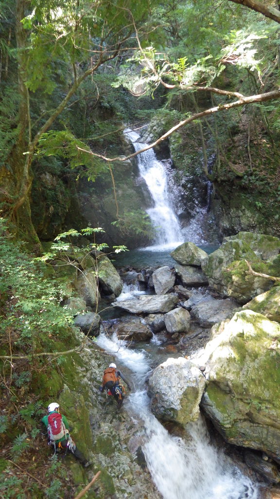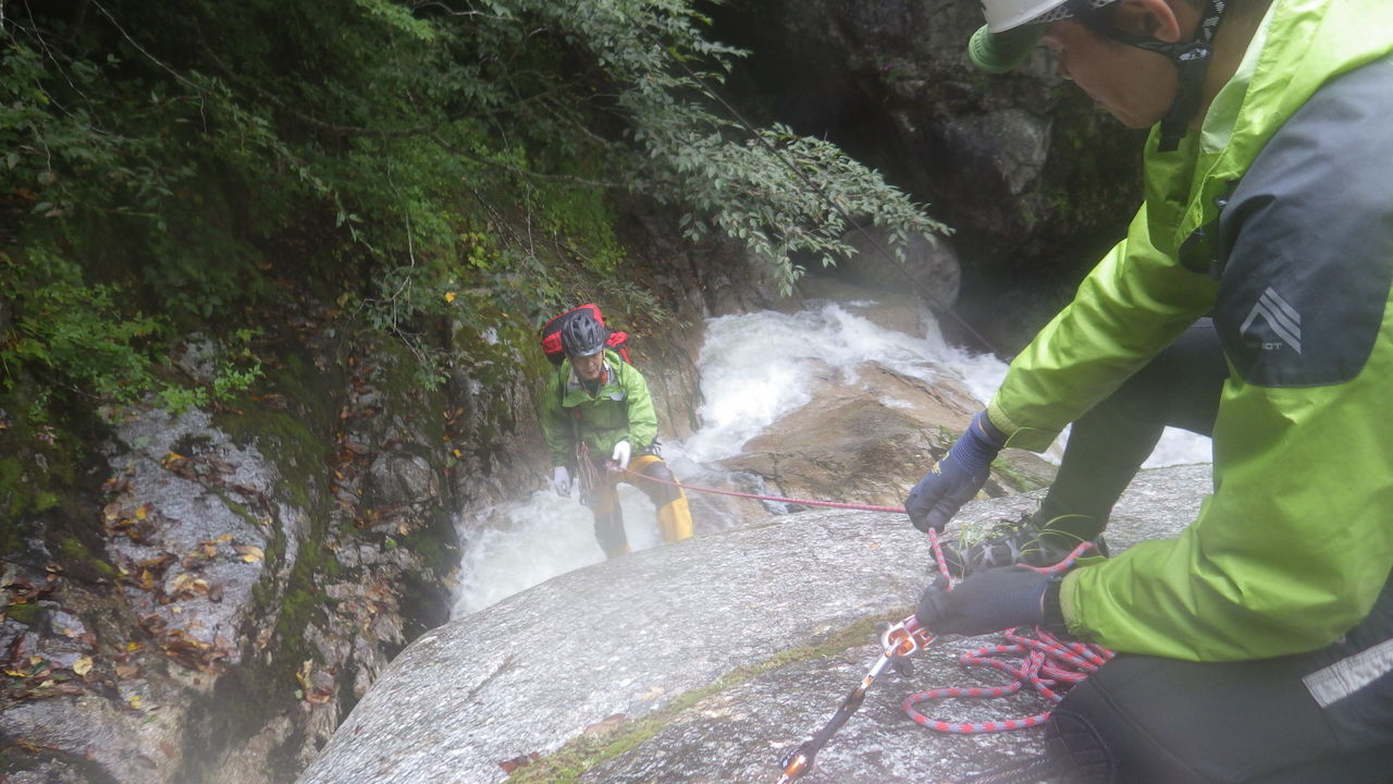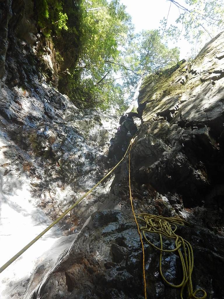 林道にちょこちょこ生えてるキノコなどを見ながらしばらく歩き、トンネルを3つ抜けた先の林道終点からフィックスロープ伝いに一応安全を期して懸垂下降なども交えつつ沢まで降りて、入渓。