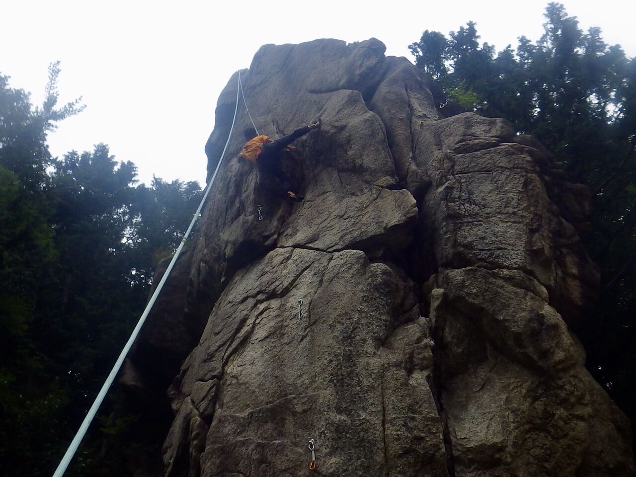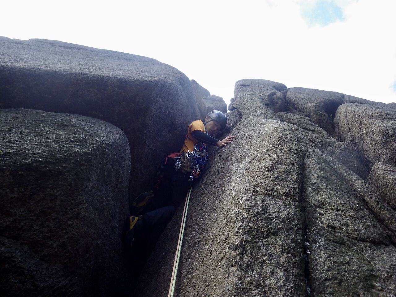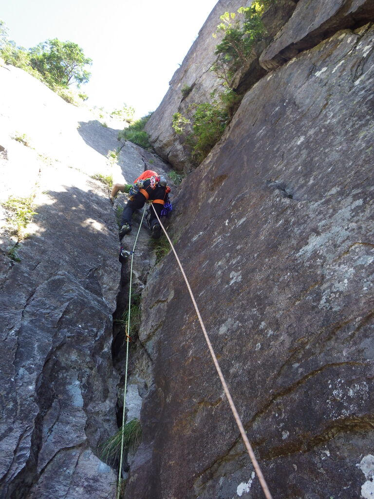 凹角というかチムニーというか、ワイドサイズのクラックを登って、次の終了店でピッチを切る。