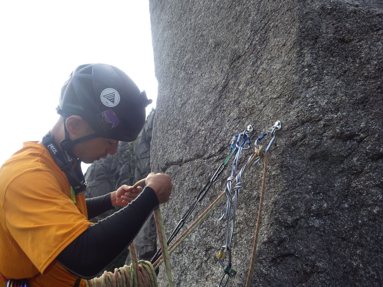 最初はピナクルを懸垂支点にしようとセットしてみたけど、降りる直前でやっぱりちょっと不安だなと思って、改めて懸垂適地を探すと、P1の頂上直下に松の木が生えていて、残置カラビナもあったので、そこから降りる。
